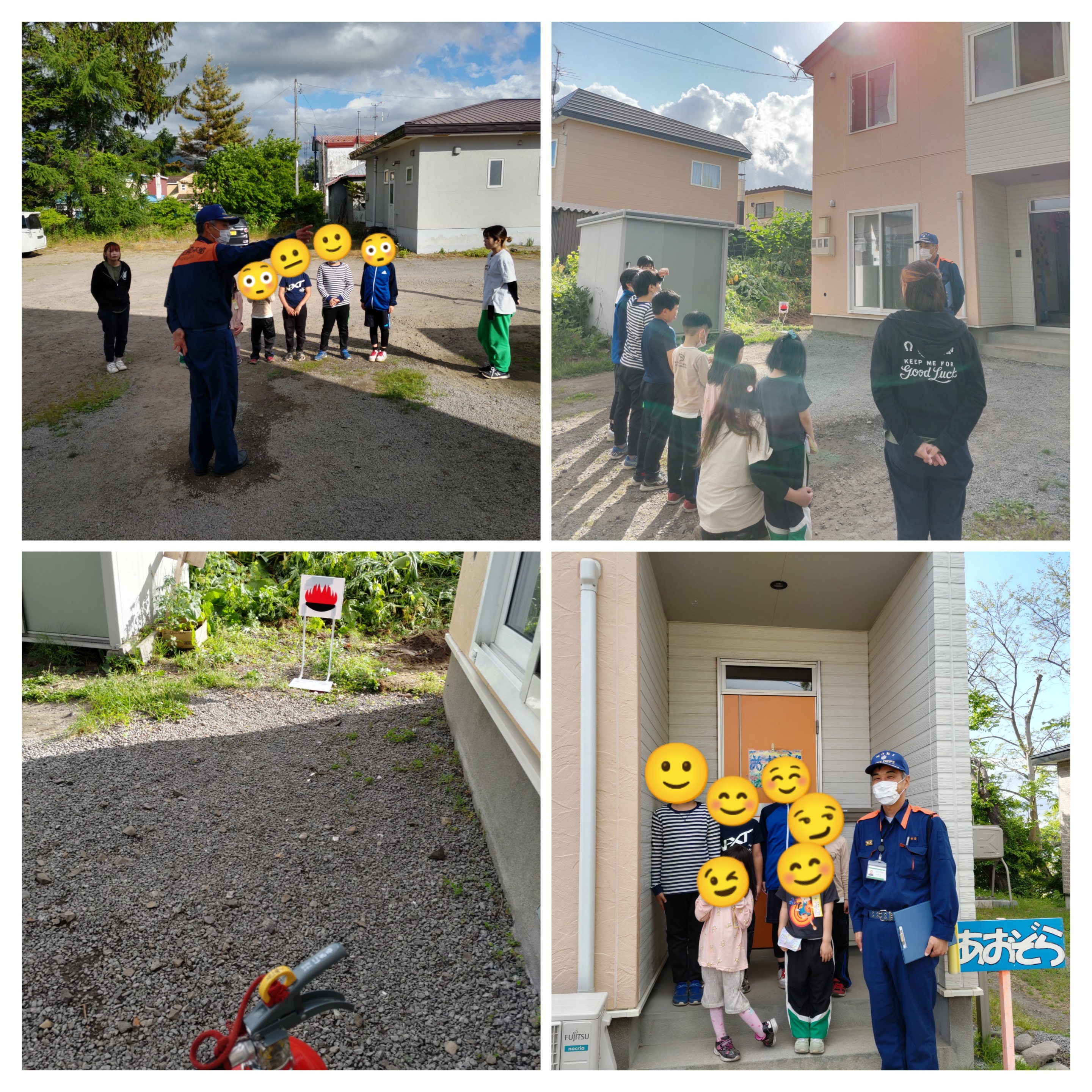 地震からの火災発生を想定し、森消防署の消防士さん立ち会いの元、余暇時間、突然の警報音にも子供達はビックリしながらも職員の声がけを聞いて落ち着いて行動出来てました。