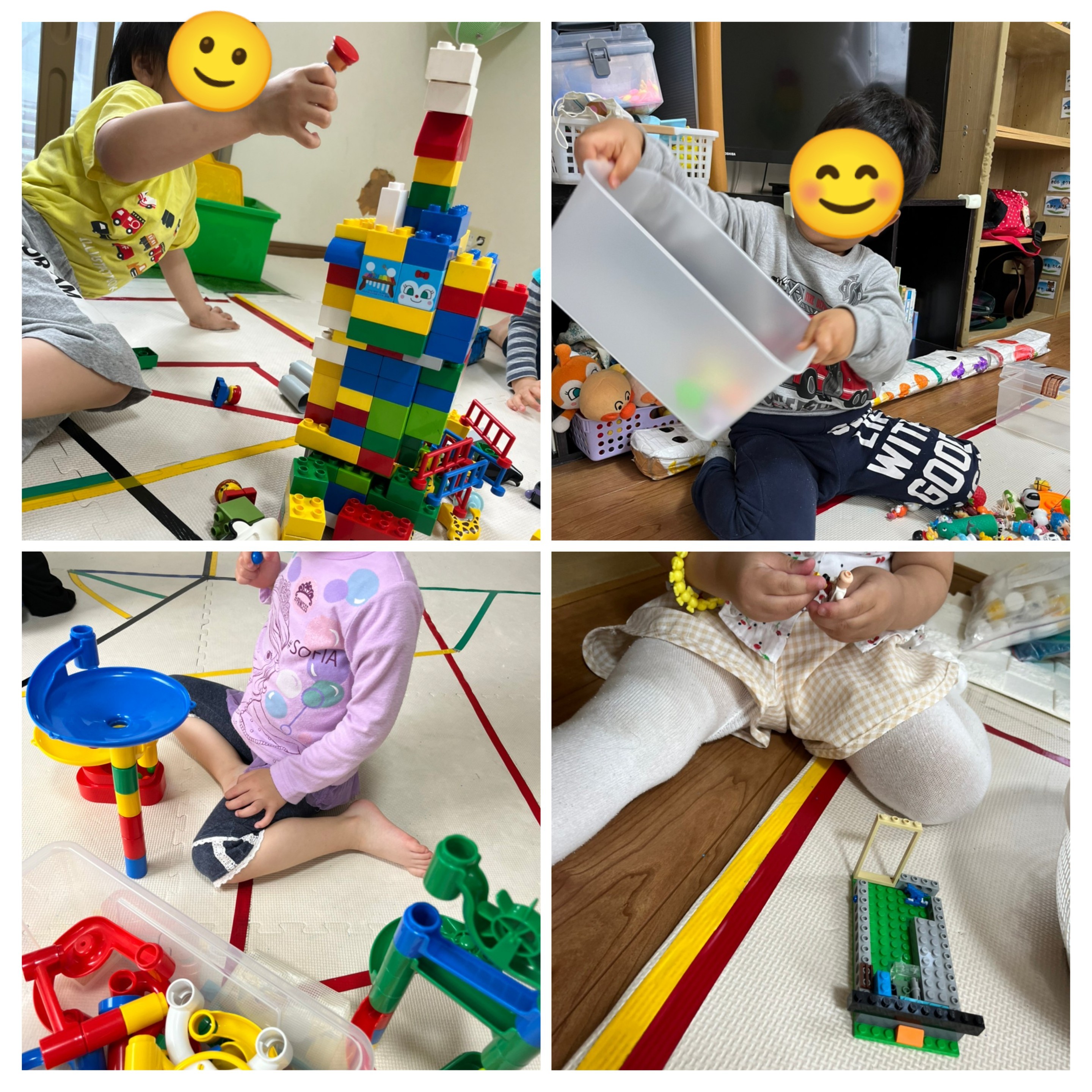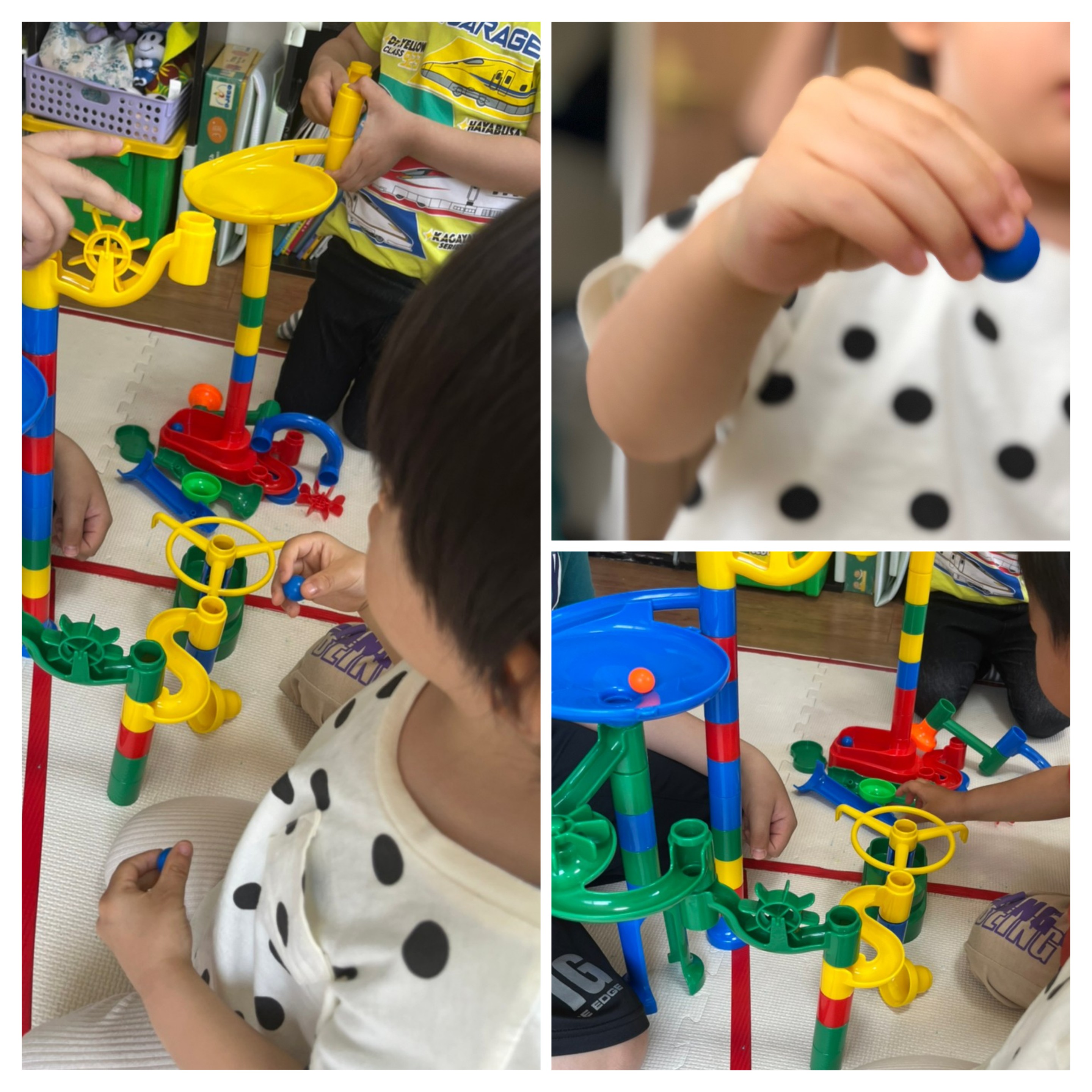 くみくみスロープでは順番待ちして交互にボールを転がして楽しんだり、レゴブロックでは高く高くお城を作ってそれぞれに楽しむ姿が沢山(◍•ᴗ•◍)✧*。