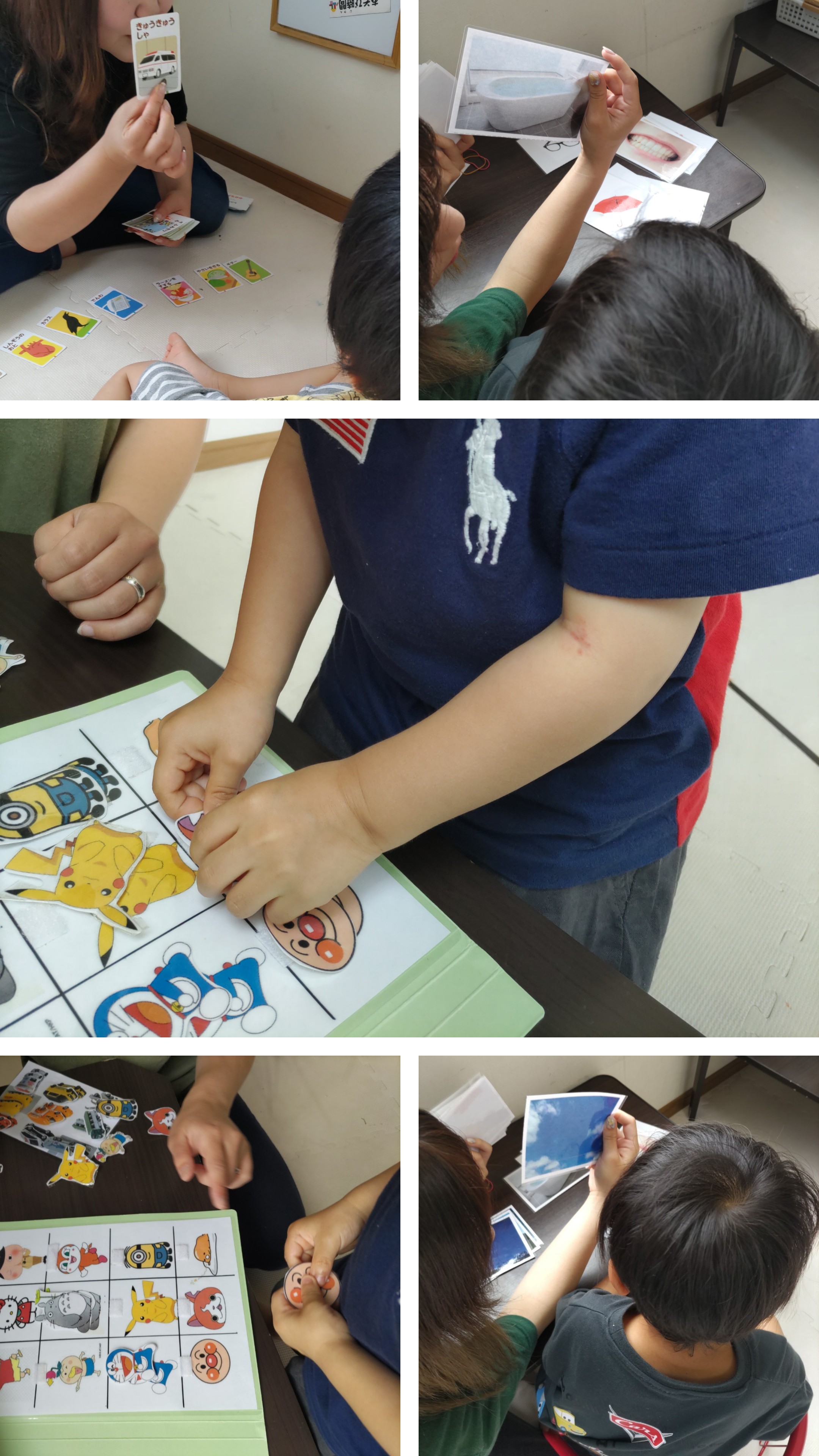絵カードや写真を見て、職員の口の動きを見て集中力高まる空間になります。