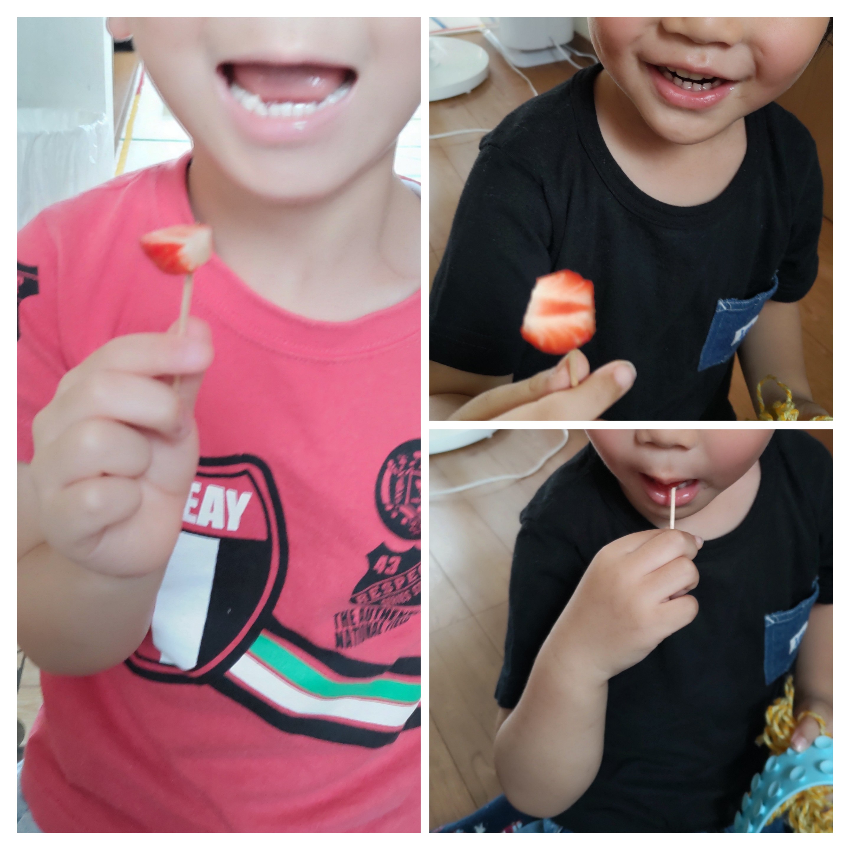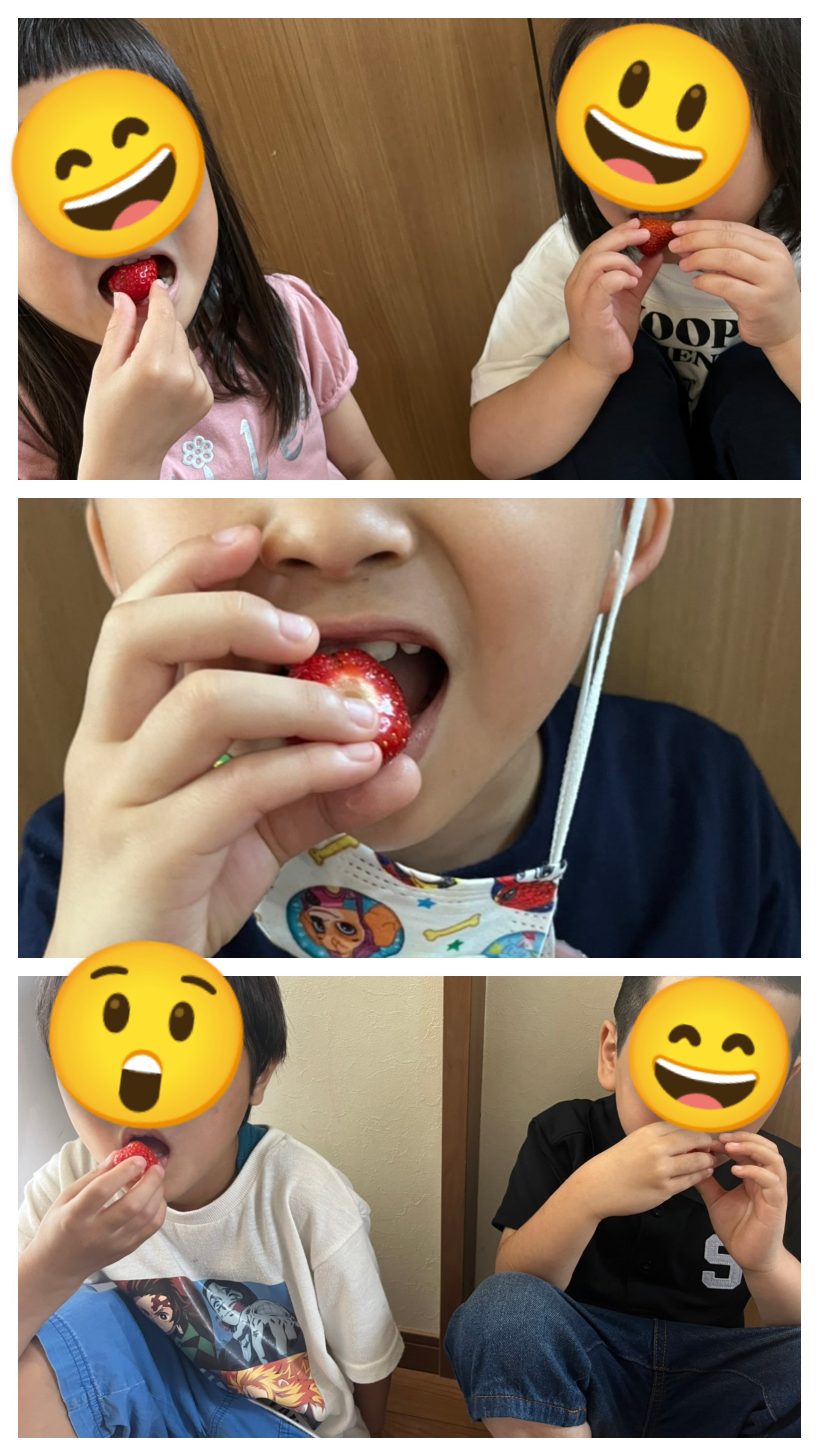 あおぞら菜園のいちごが沢山色づいたので自分達で収穫し、やっと一人一粒食べれました(◍•ᴗ•◍)❤