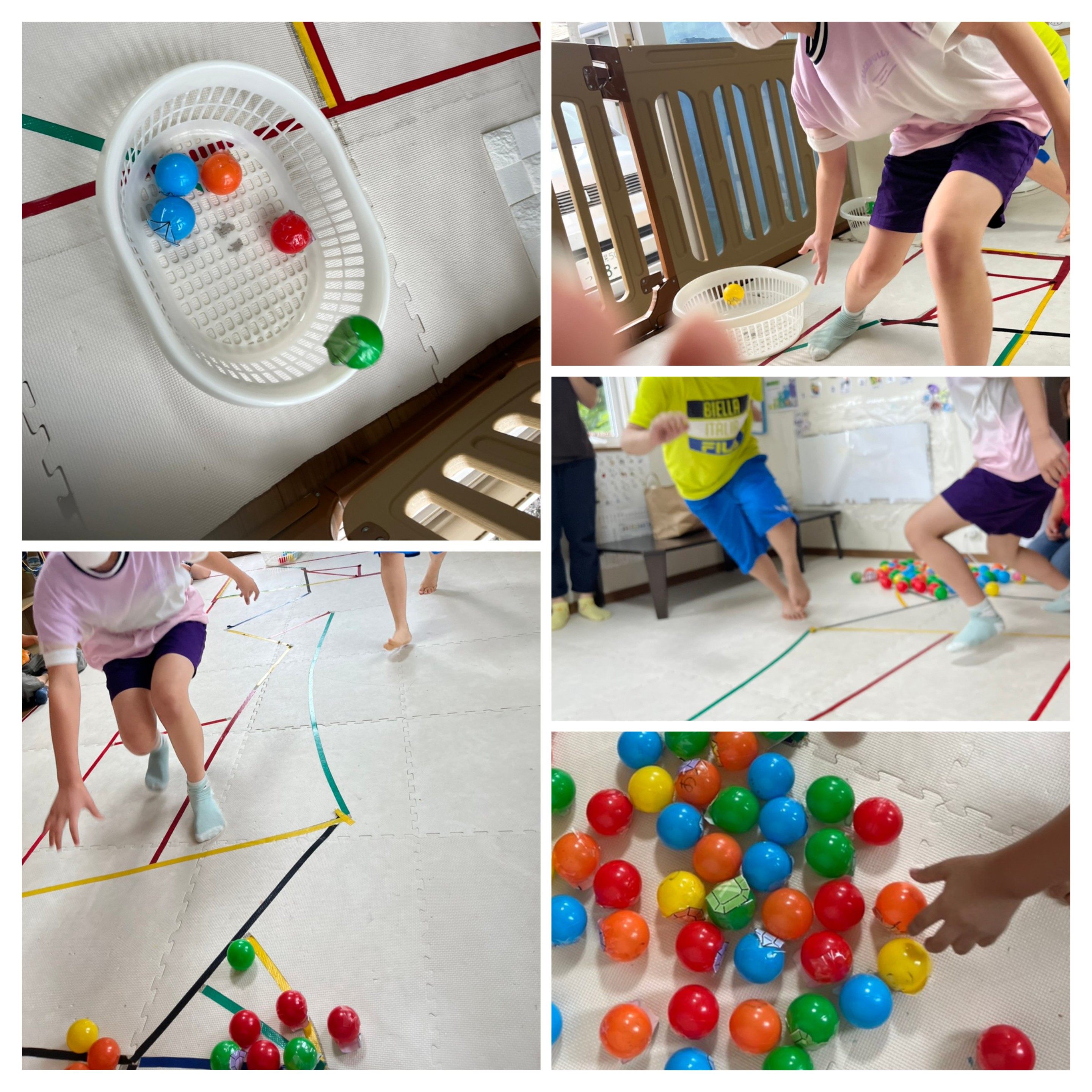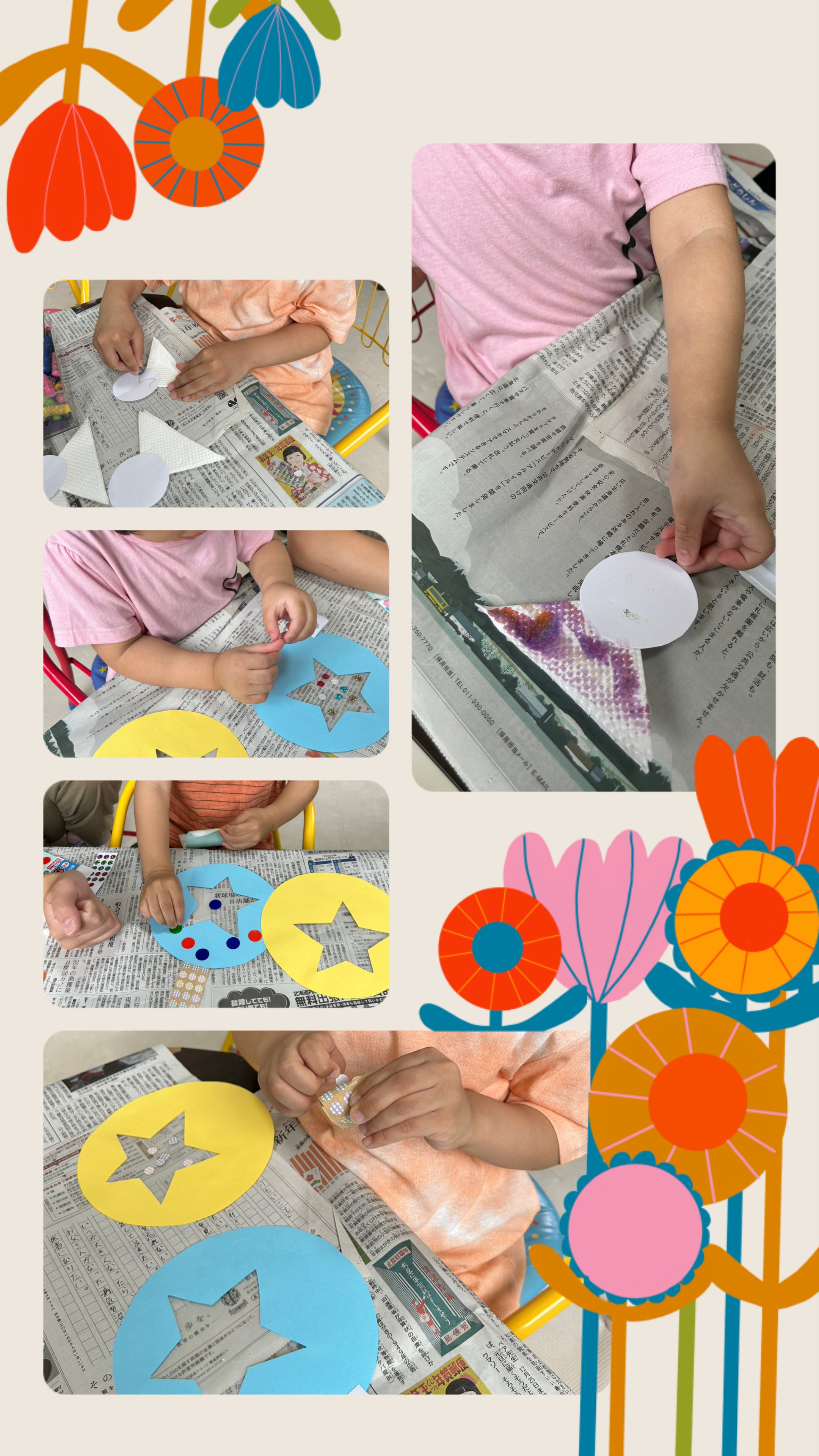 「オレンジ!あお!あか!」と手にする色を発語しながら楽しんで取り組む姿が沢山( /^ω^)/♪♪