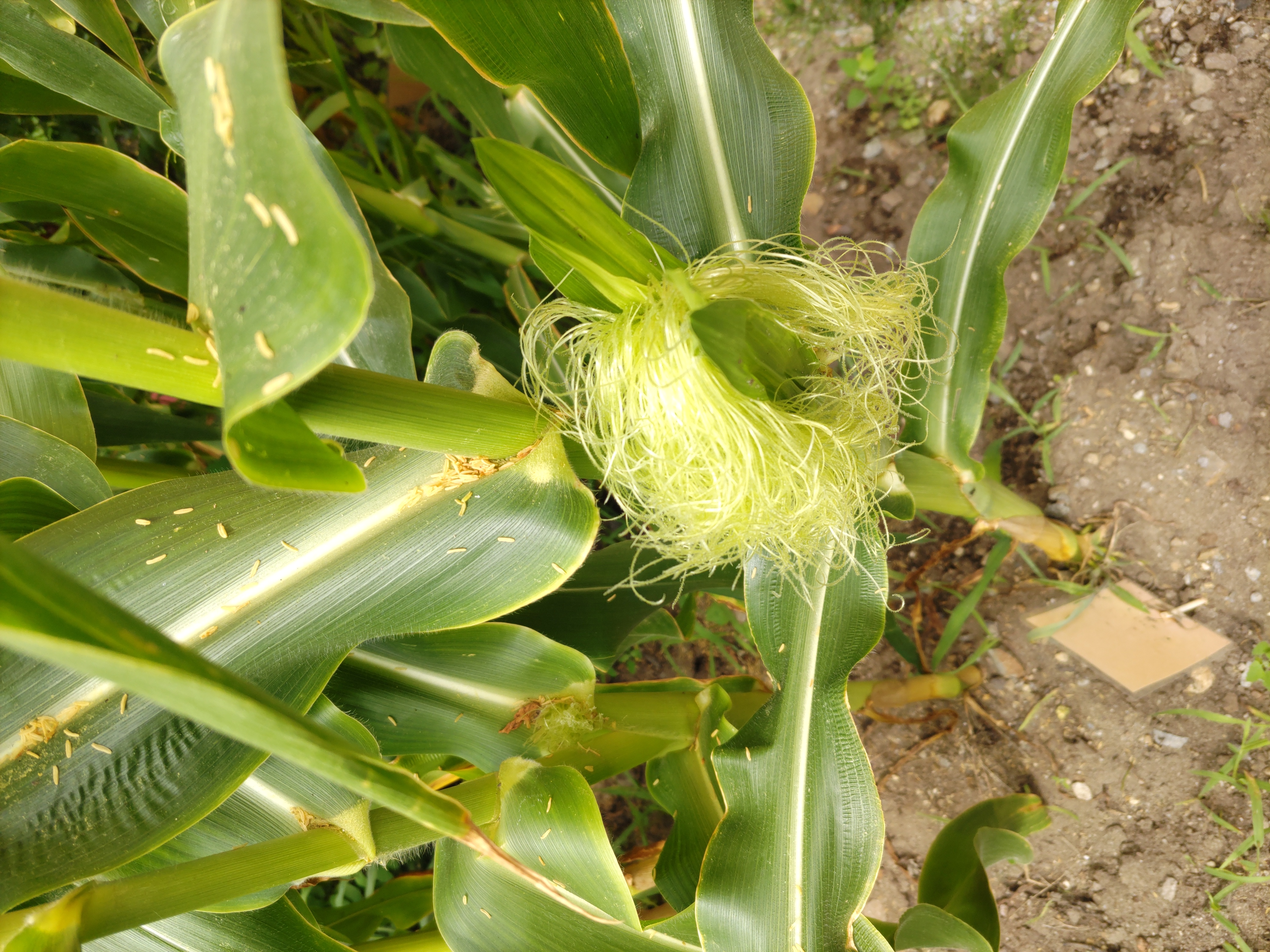 「先生!!!(((;ꏿ_ꏿ;)))やっととうもろこしでてきたのに、少し虫に食べられてます(⑉⊙ȏ⊙)!!」