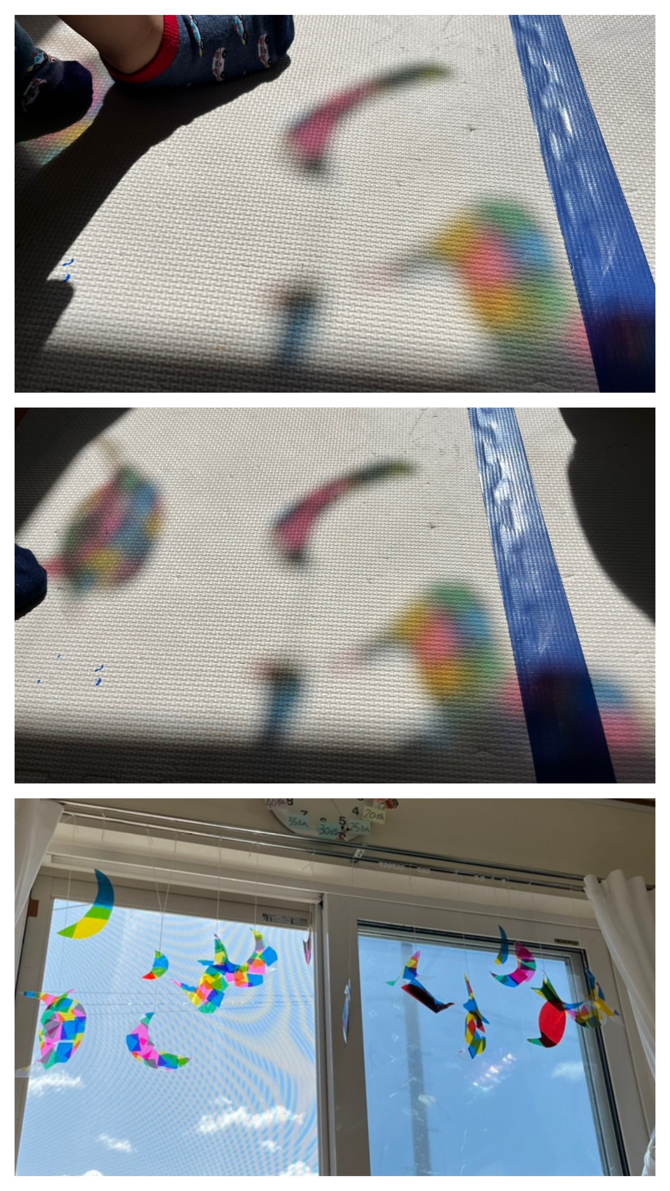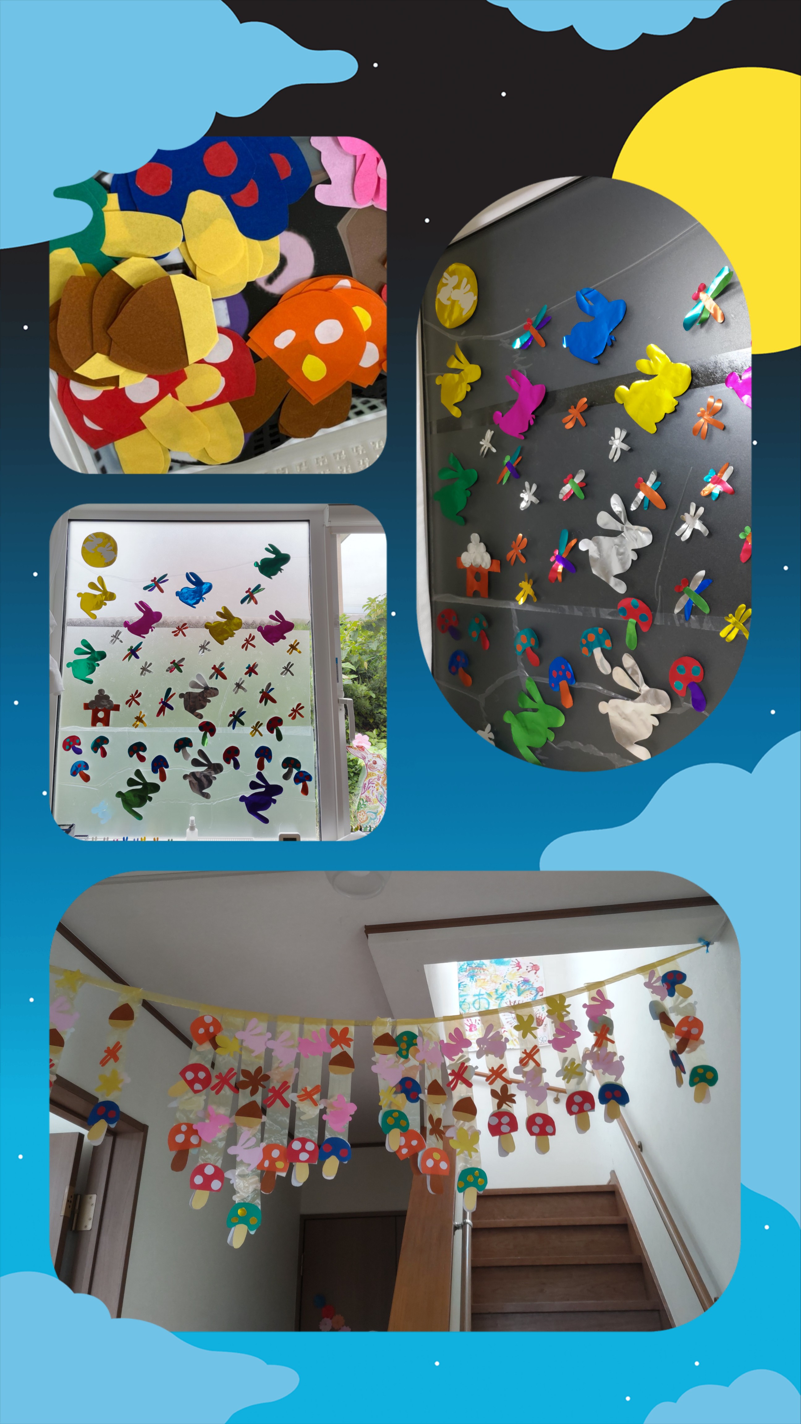 カラーセロハンを使い月やカボチャ、オバケ等吊り下げゆらゆら太陽の光があたるとキレイです(◍•ᴗ•◍)✧*。