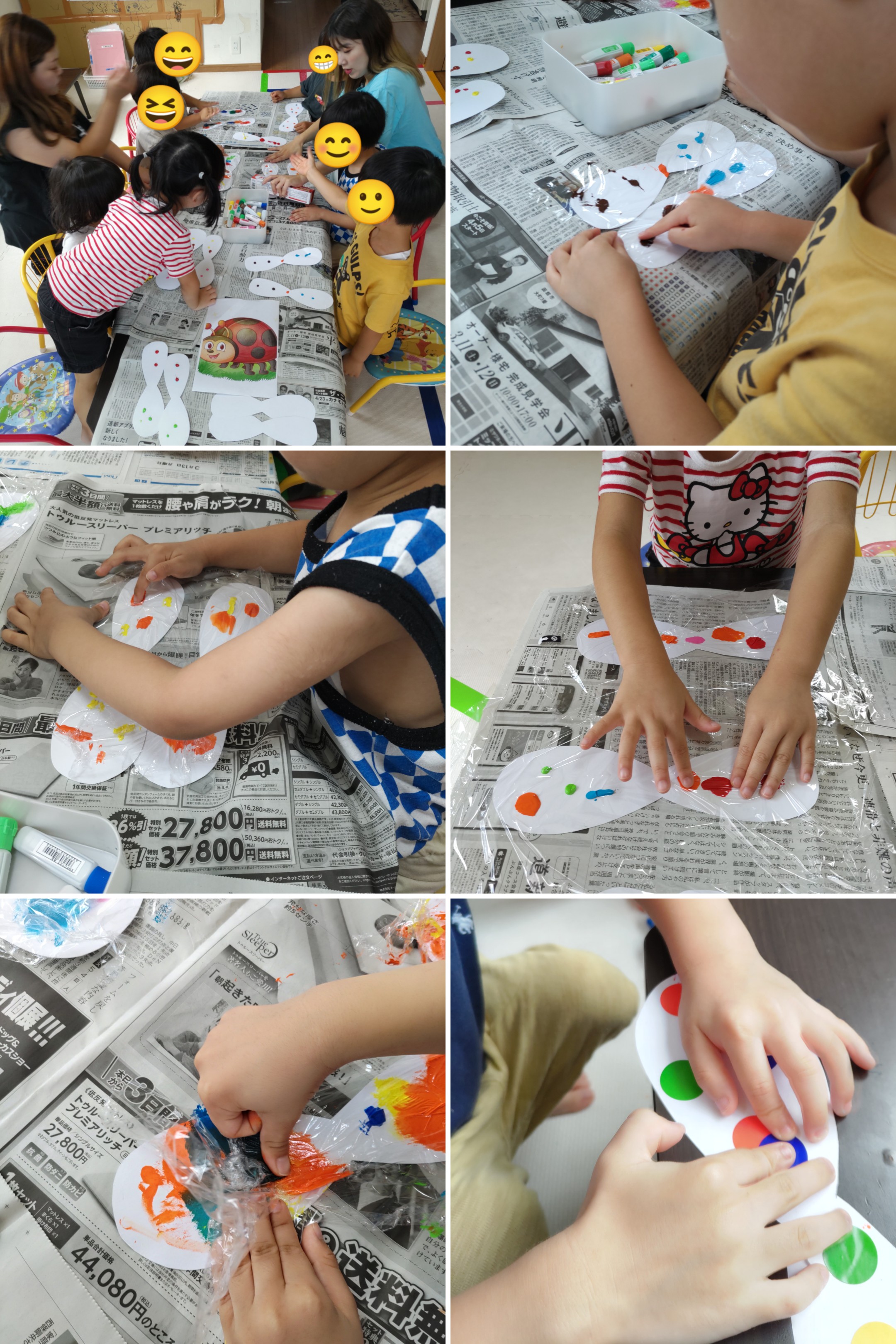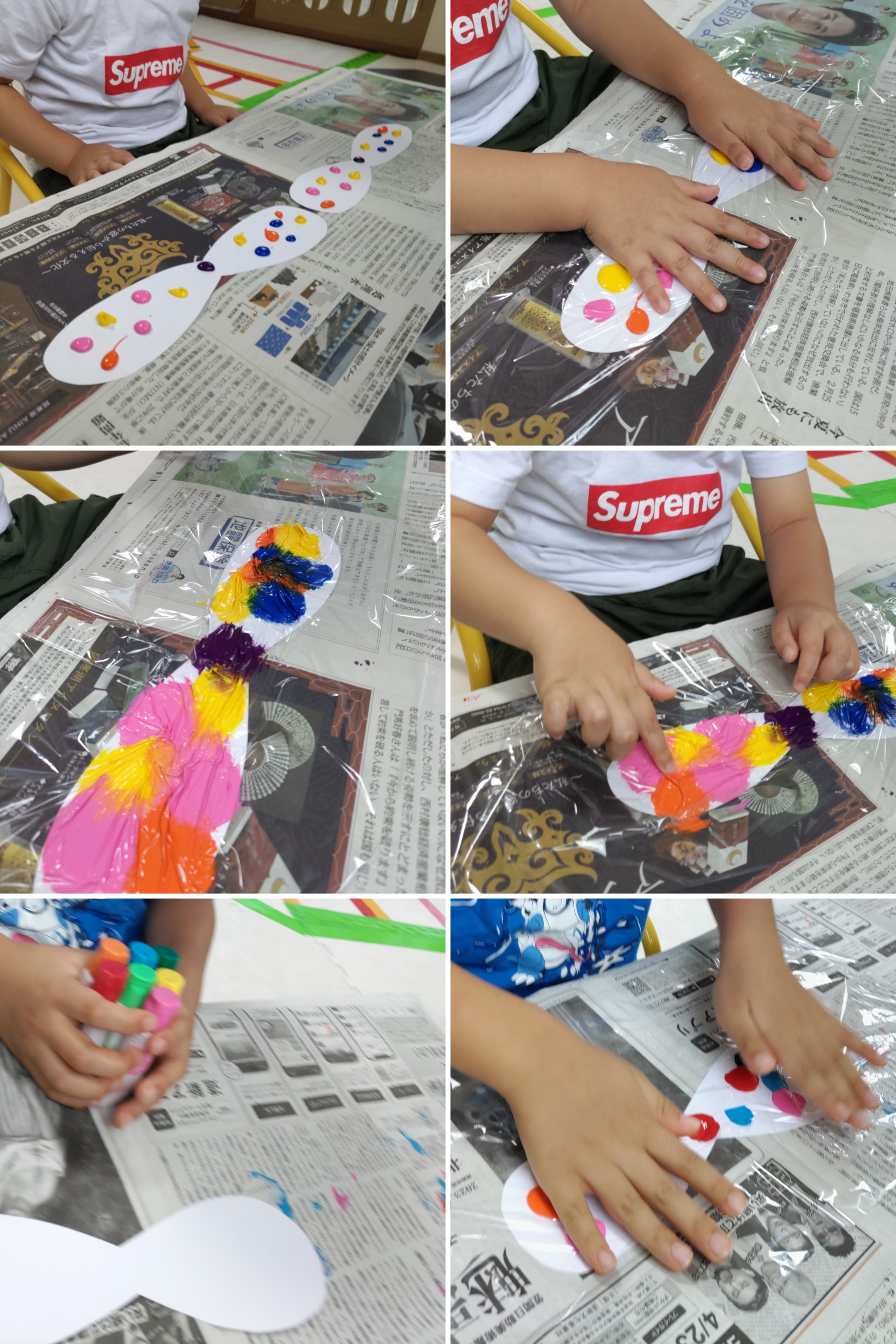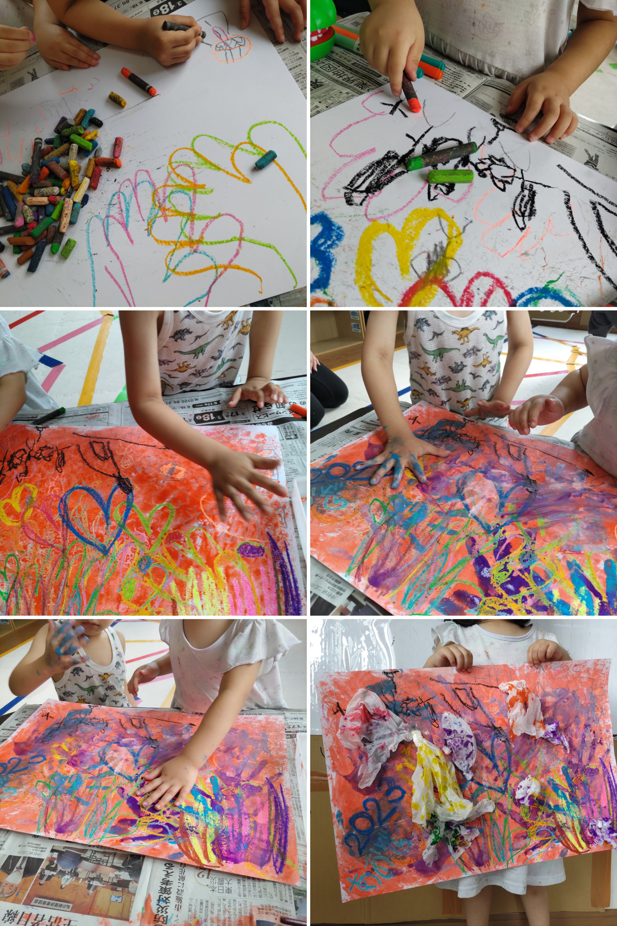 クレヨンで描いた上から手のひらに絵の具をつけて自由にペタ!ペタ!