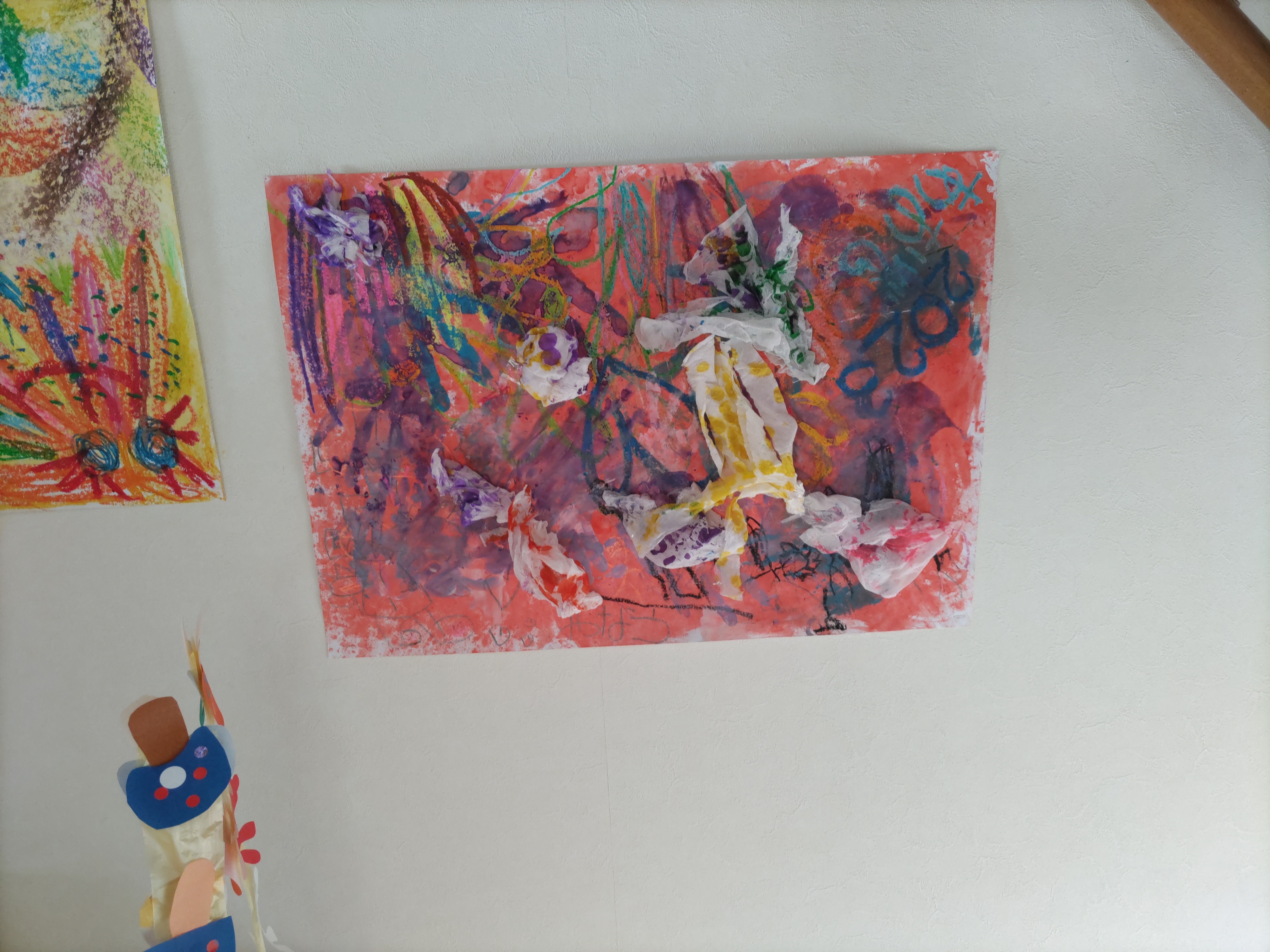 ティッシュペーパーにポンポンペンで色づけし貼り付け、ティッシュペーパーがアートに╰(⸝⸝⸝´꒳`⸝⸝⸝)╯