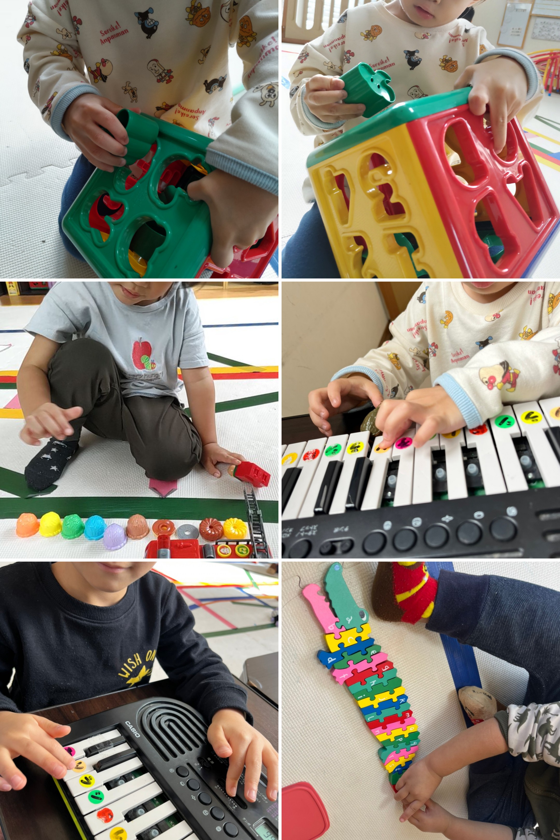 余暇時間では、ミニキーボード演奏や、お店屋さん開店、カラー型はめ、アルファベット積み木等、好きな事、興味のあることに、まっしぐら!!夢中!!