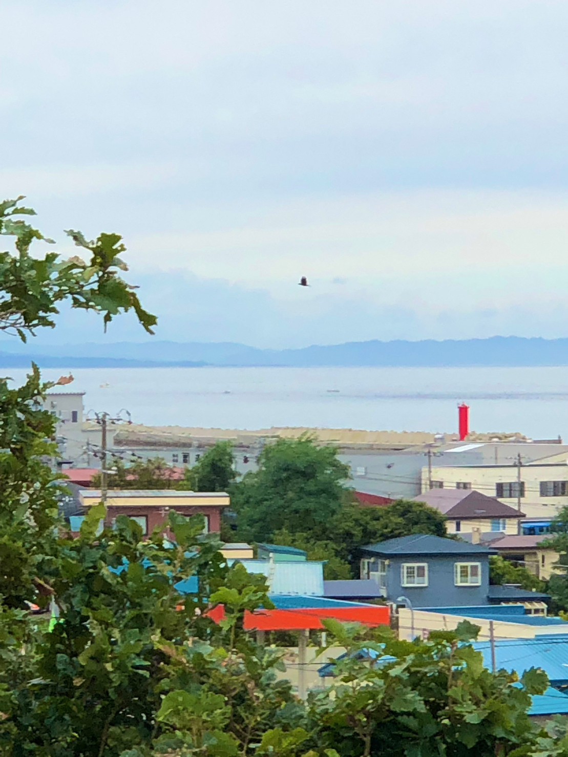 国道278号線砂原地区から望む砂原灯台と噴火湾。