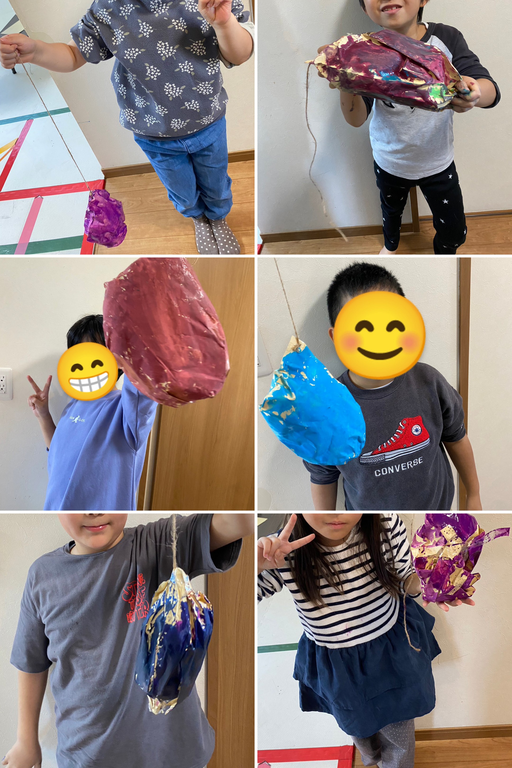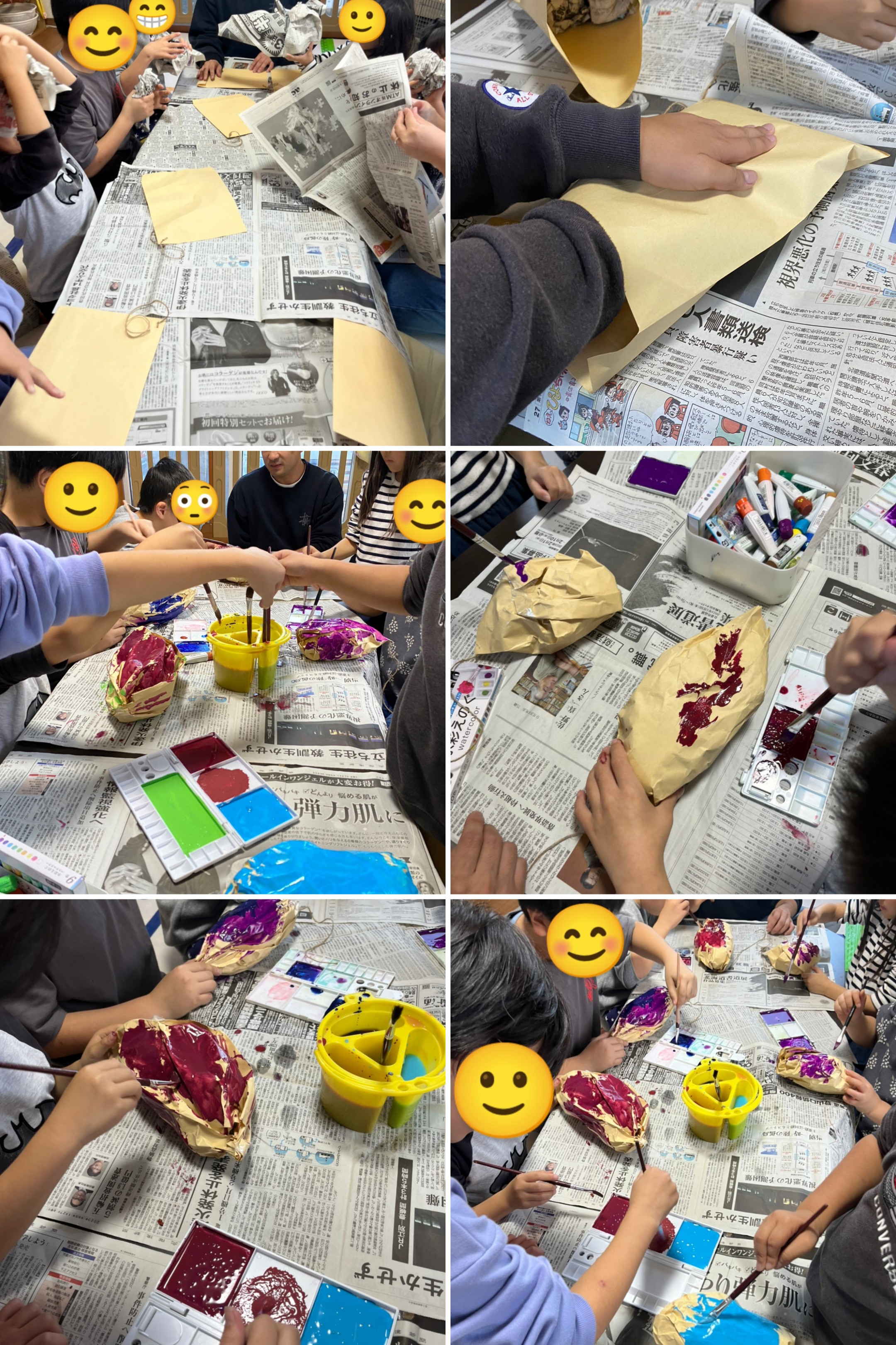 茶封筒の中に丸めた新聞紙を詰めて形を整えて、好きな色の絵の具を塗り、オリジナルサツマイモ完成( /^ω^)/♪♪