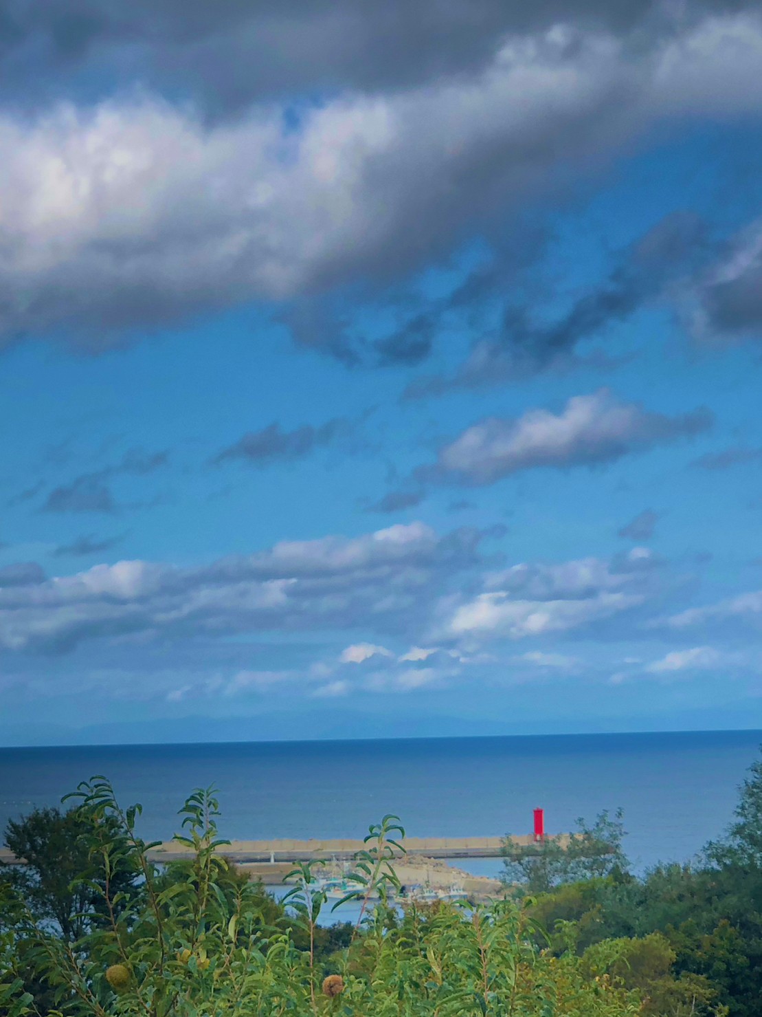 砂原駅から望む砂原漁港灯台と噴火湾。