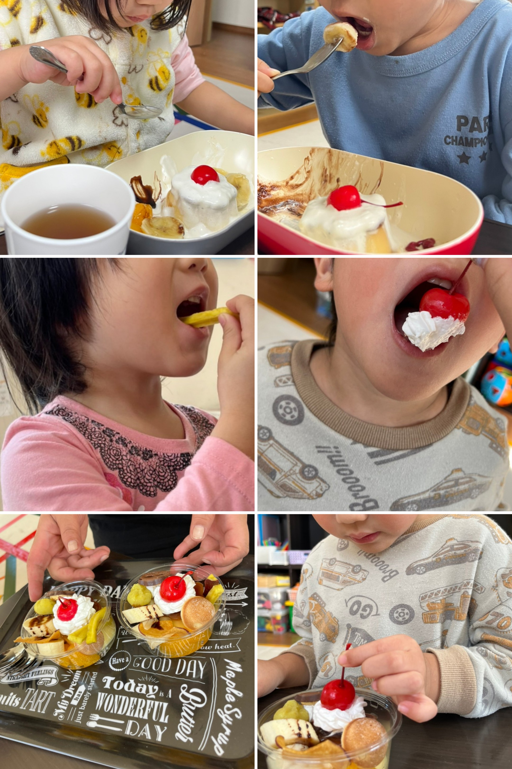 お友達と笑顔でクリームを口のまわりにつけながら、頬張る姿が微笑ましい╰(⸝⸝⸝´꒳`⸝⸝⸝)╯