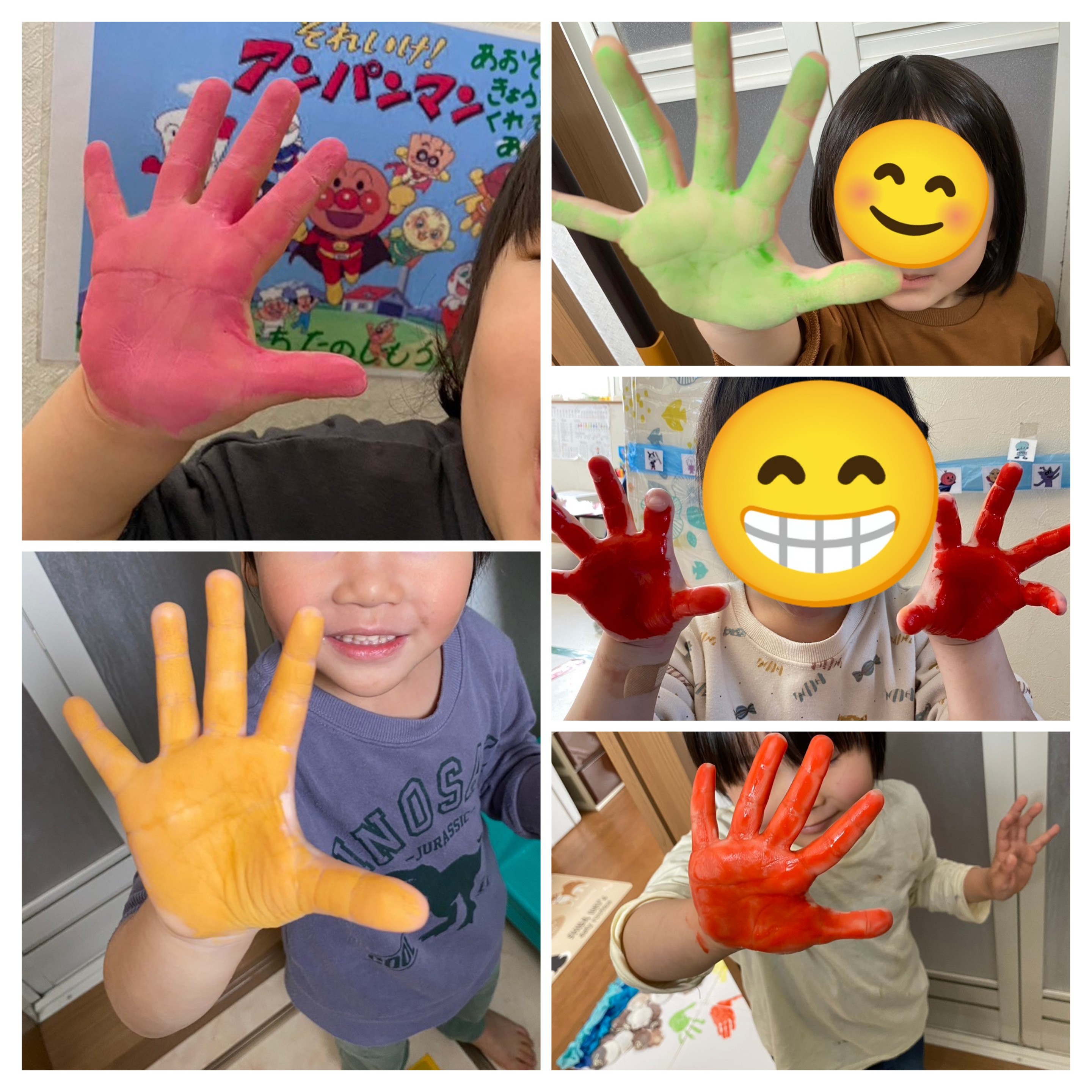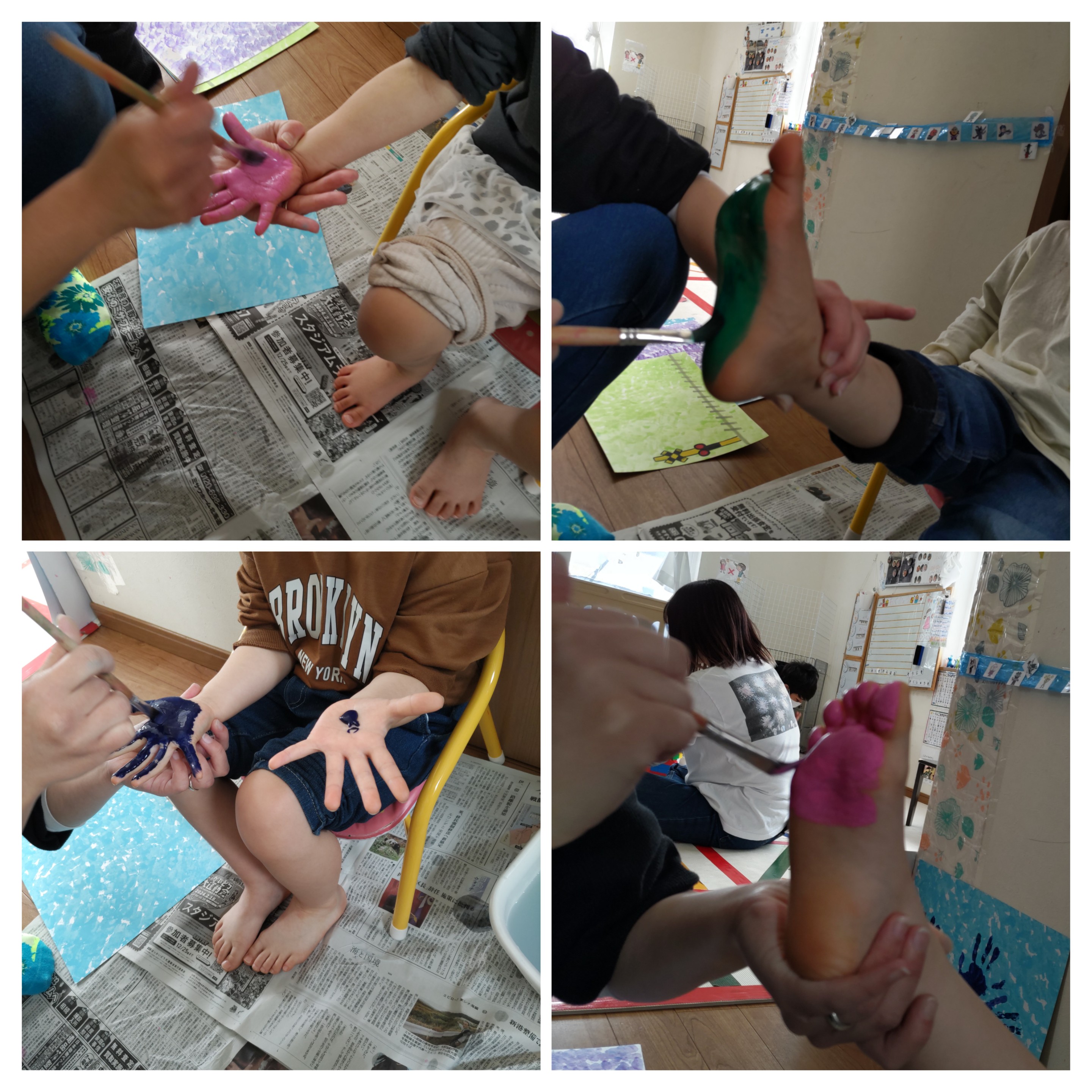 両手両足に好きな色を選び絵の具を塗り手足型をとりました╰(⸝⸝⸝´꒳`⸝⸝⸝)╯