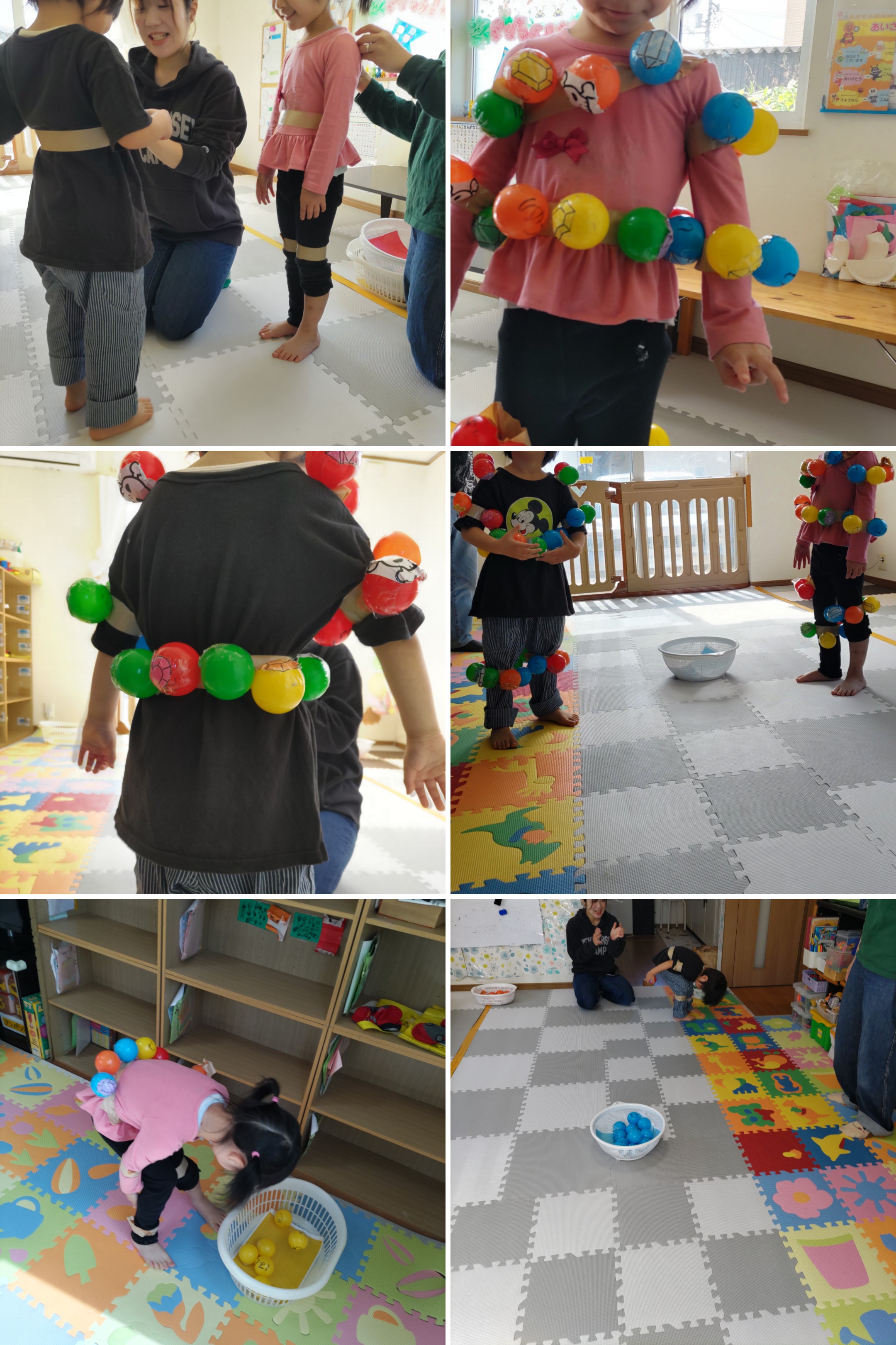 全身につけたカラーボールを色分けしたザルの中に入れて