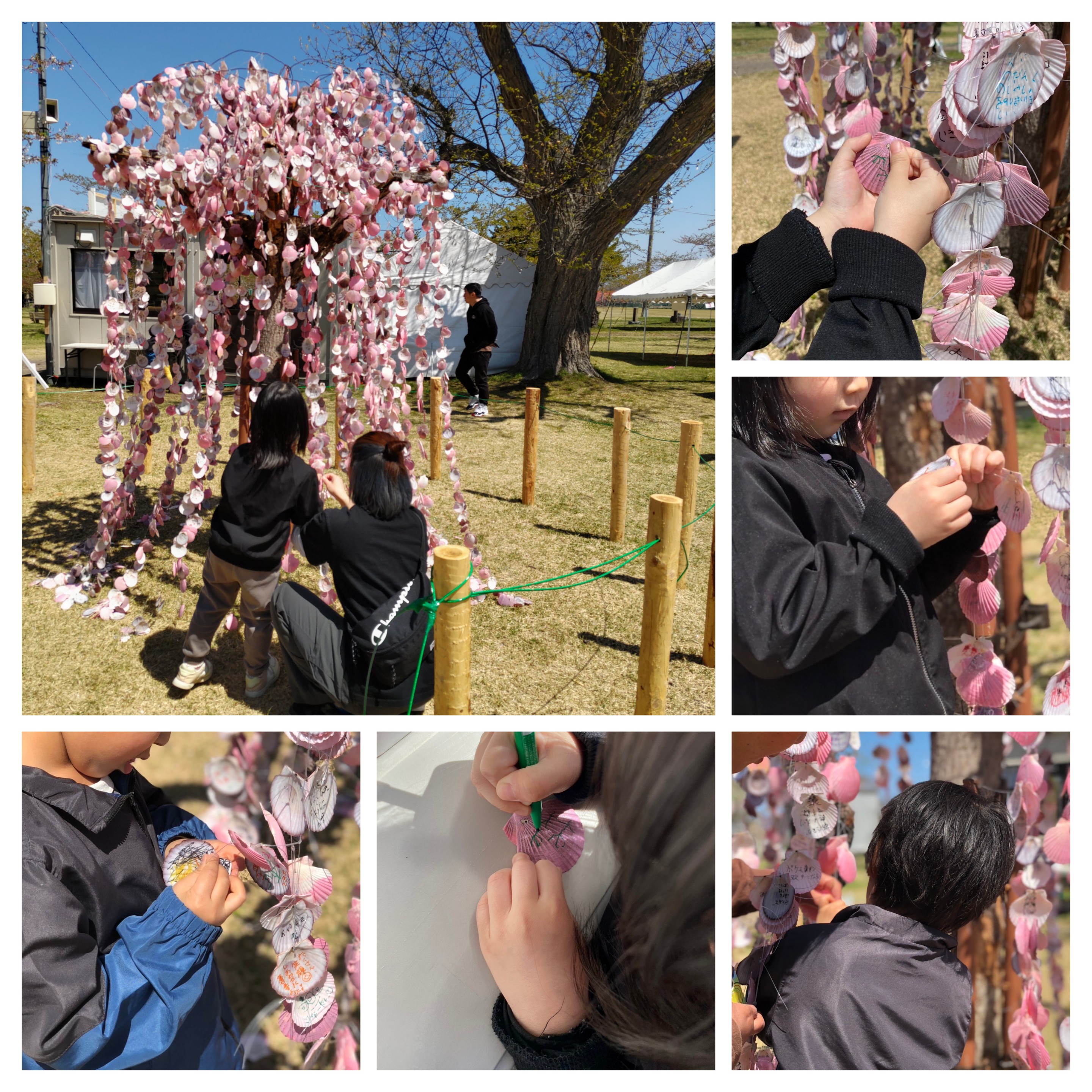 ピンク色に塗ったホタテの貝殻に願い事を書いて耳吊りのように結びみんなの思い願いが一つの桜の木に(*˘︶˘*).。*♡