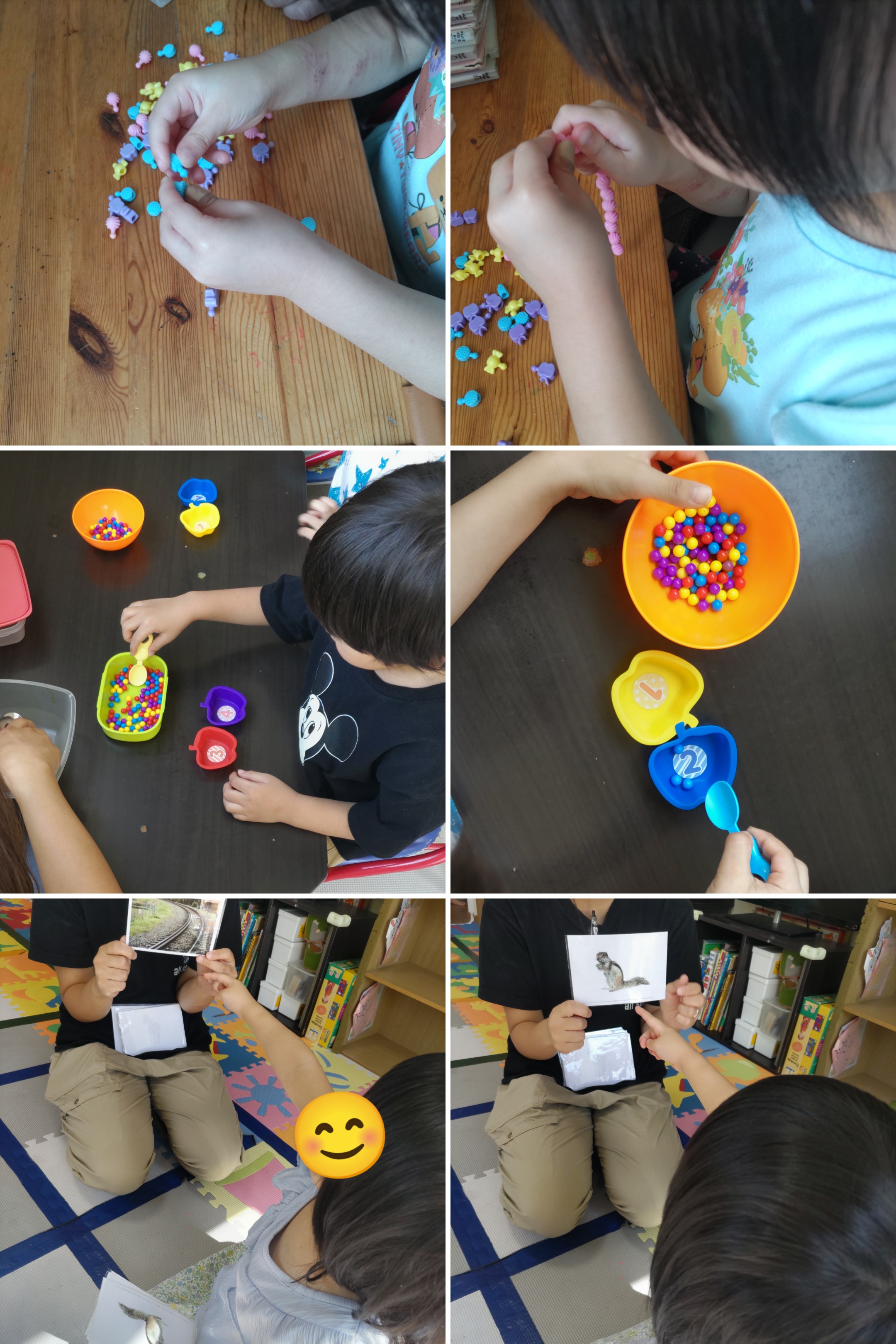 指先の力アップ↗↗プチプチ繋ぎ、カラービーズ色分け、
