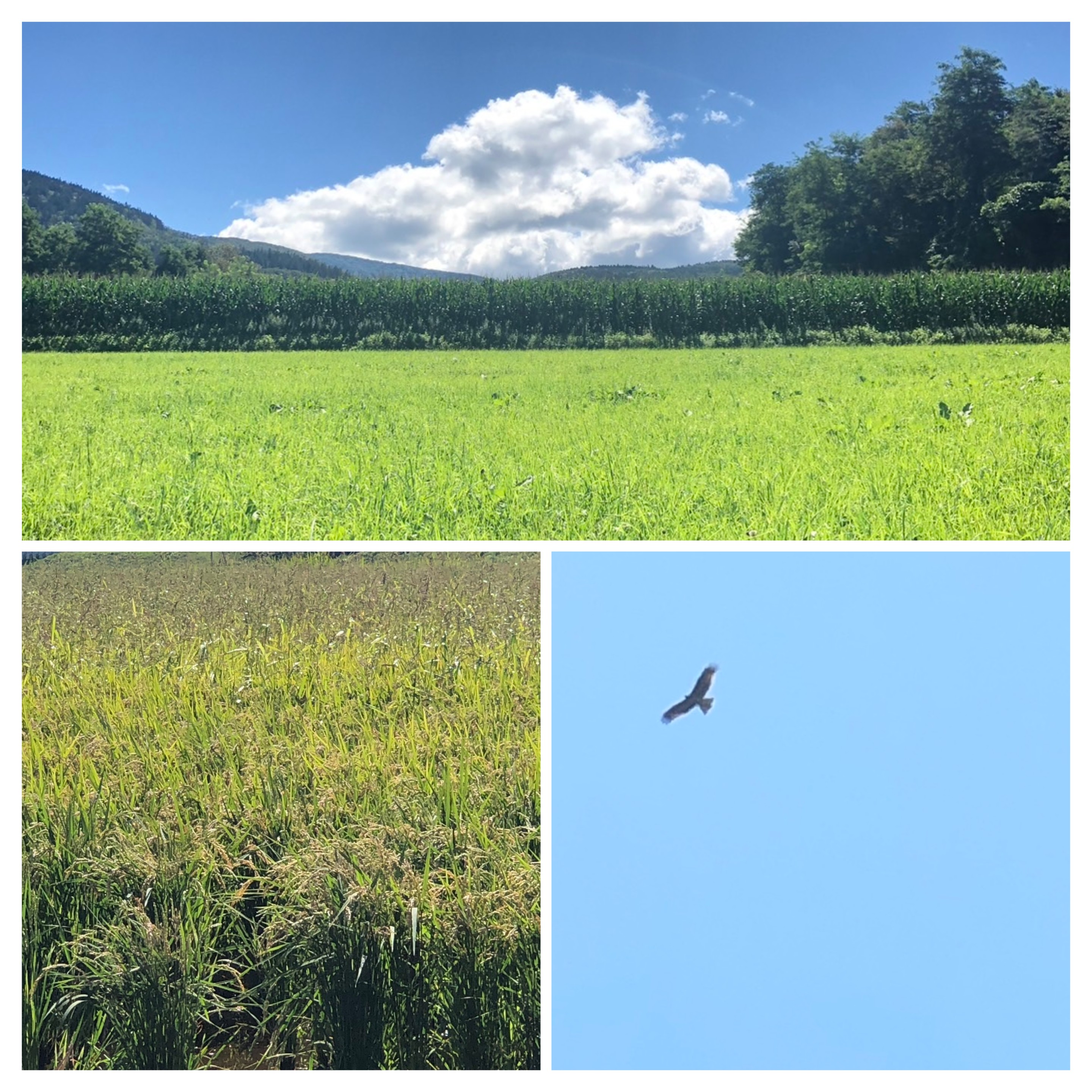 田んぼには頭を垂れた稲穂が収穫時期を迎え、鳶も気持ち良さそうに羽を広げ優雅に飛んでる森町の山の風景。