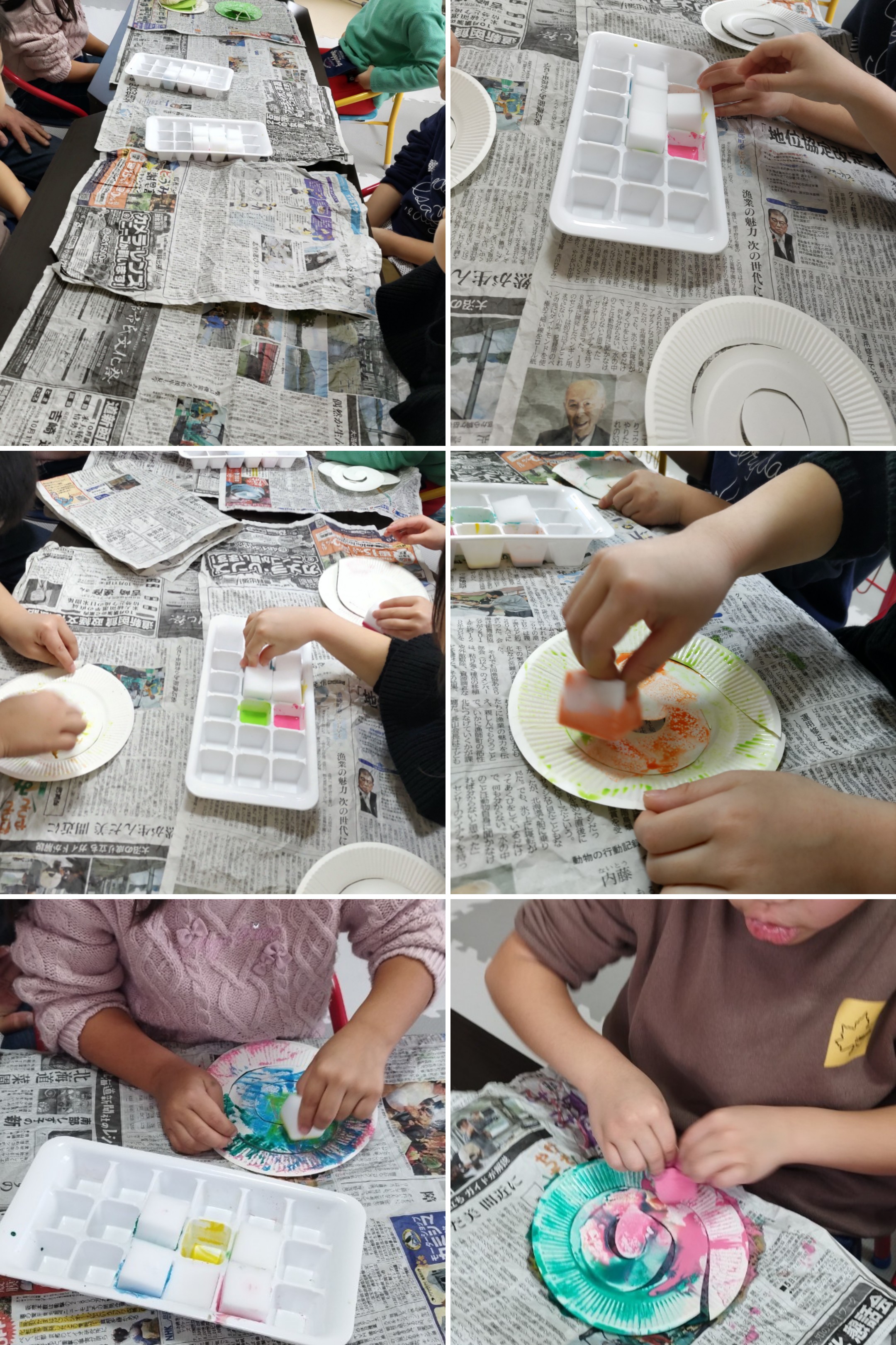 スポンジに絵の具を含ませ紙皿にポン!ポン!