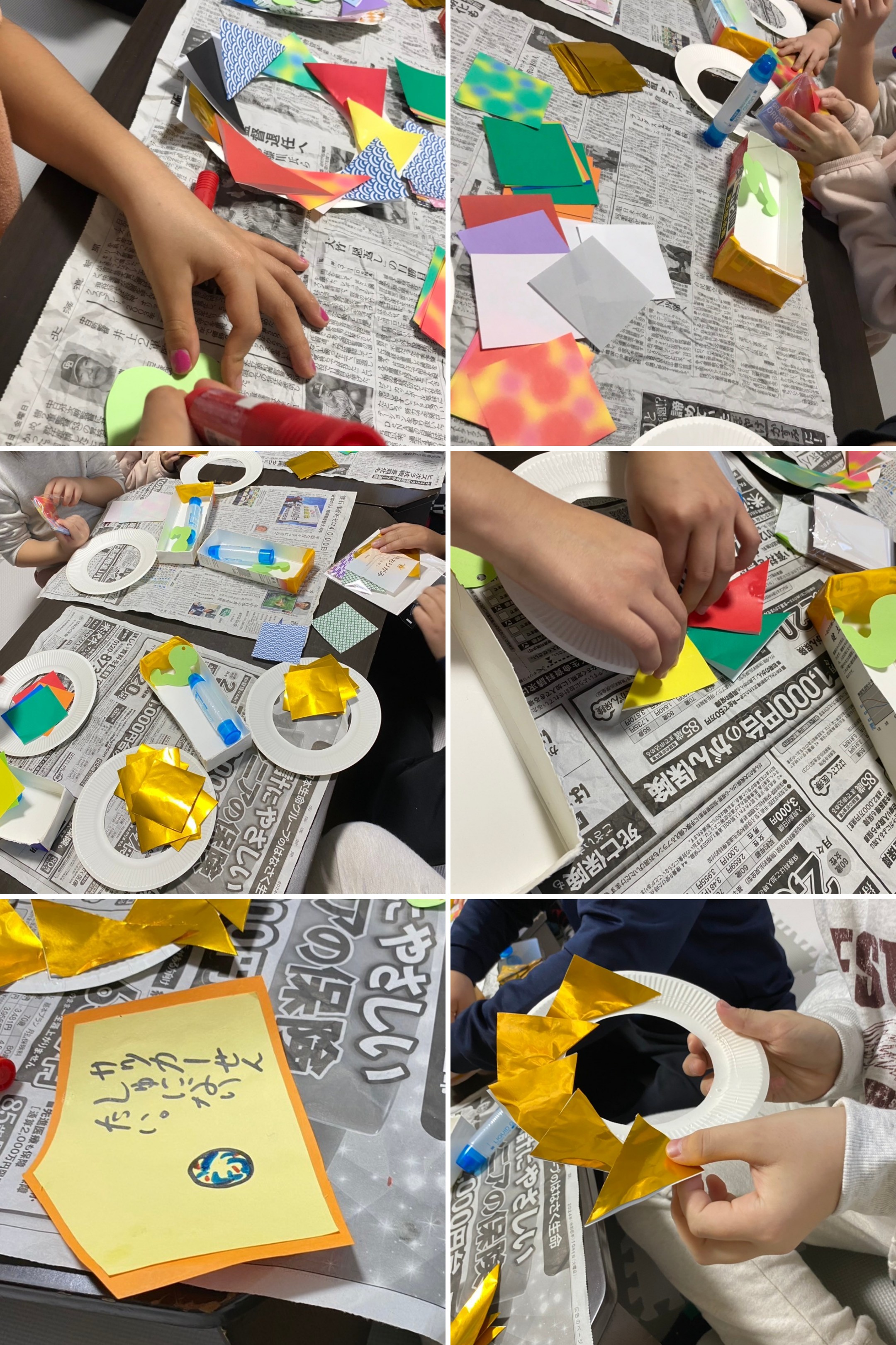 紙皿を使用し好きな色の折り紙を貼りつけていきます(. ❛ ᴗ ❛.)