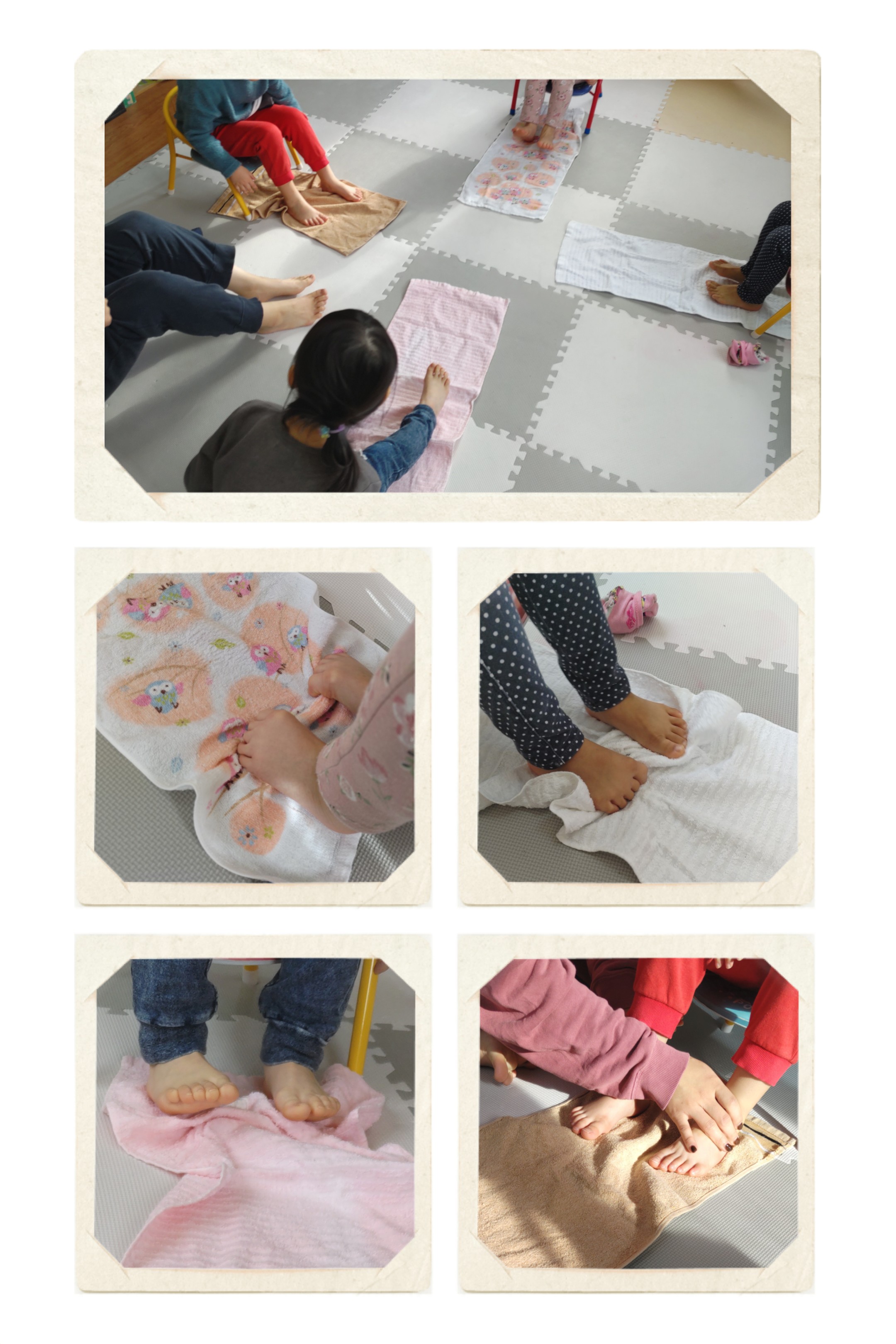タオルを足の指の力でイスの下までグーパーで引っ張るよ!!