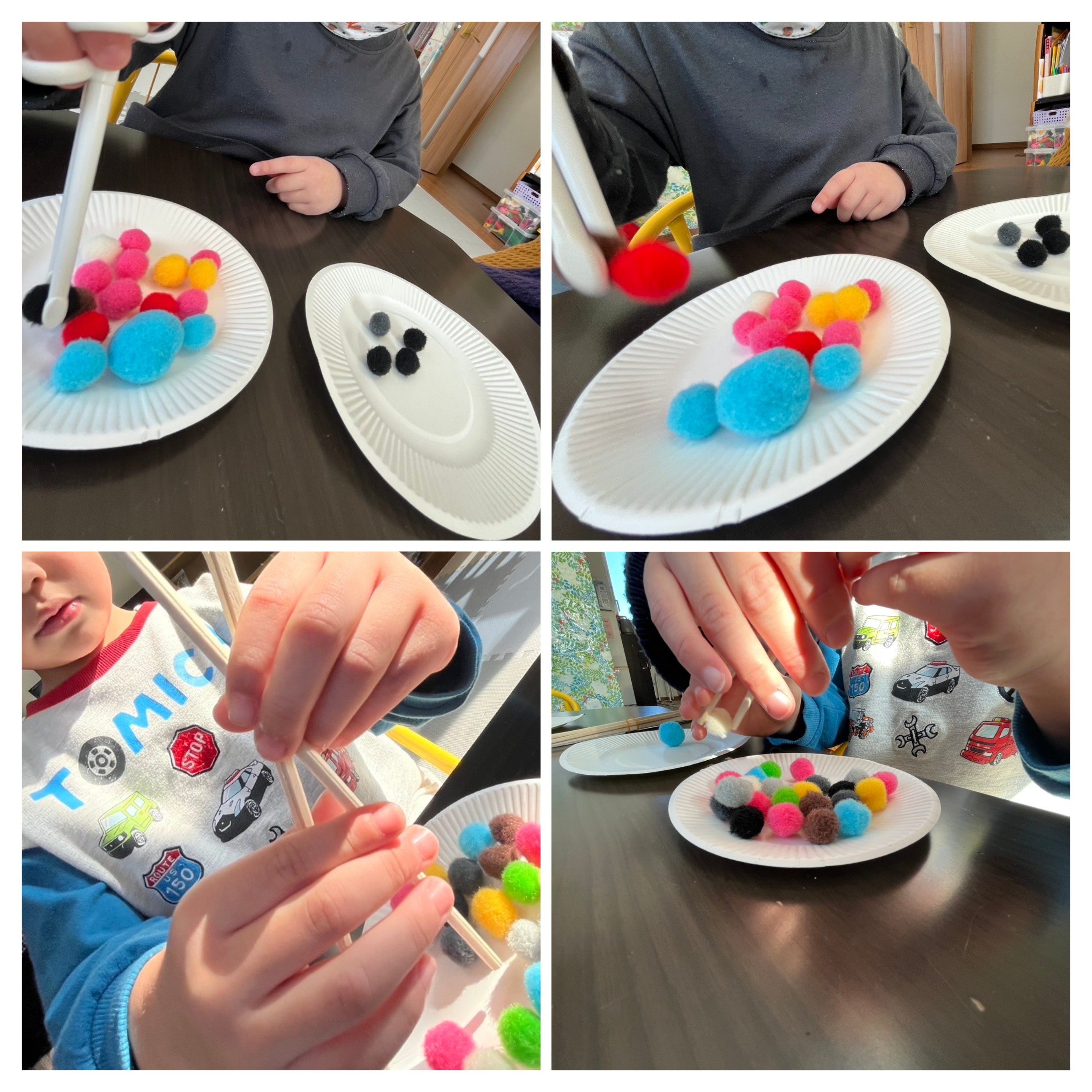 大小のモケモケカラー玉をお皿からお皿に移すよ〜(. ❛ ᴗ ❛.)