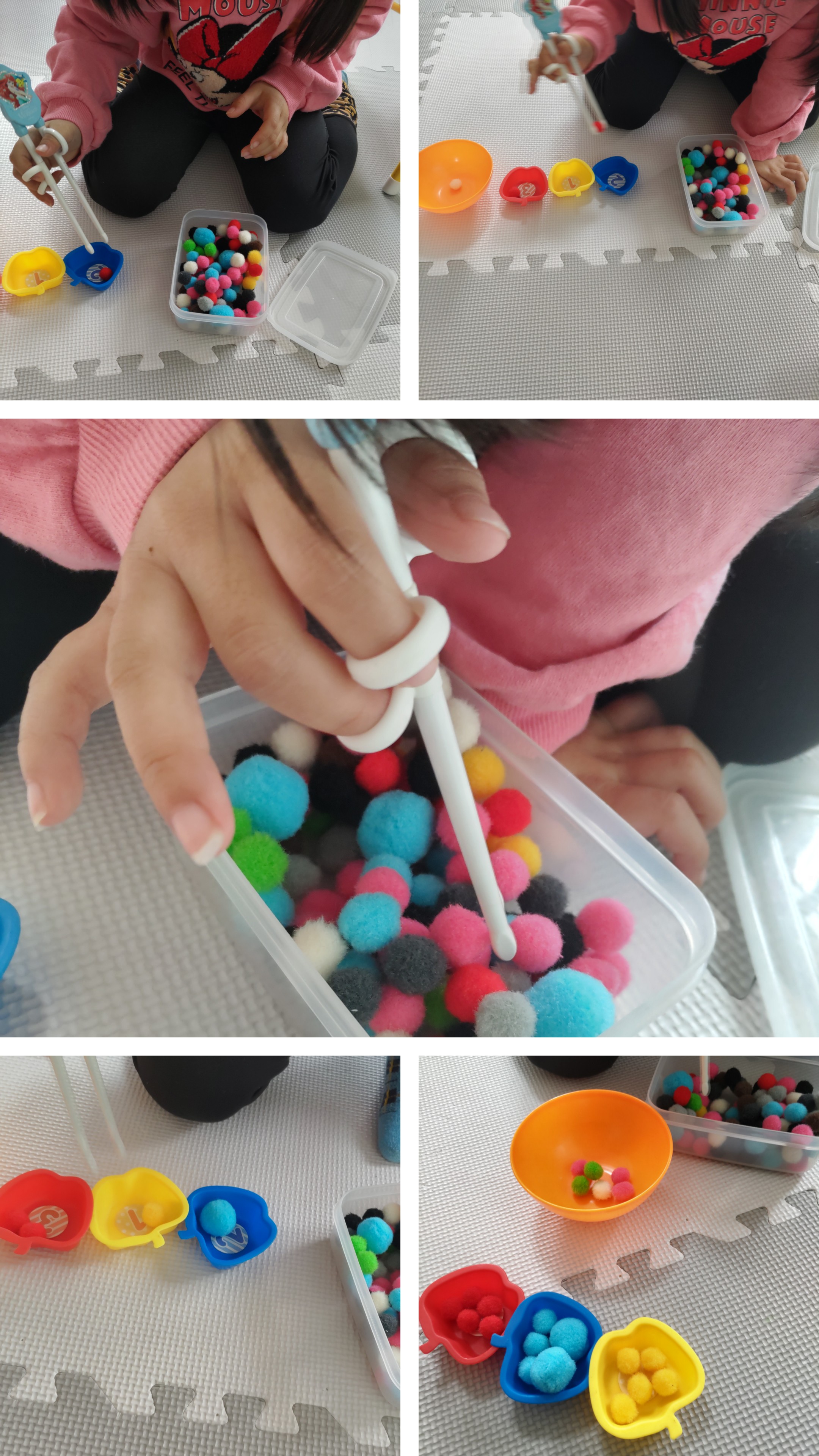 お箸練習では小さなモケモケ玉を同じ色の器に移すよ\(๑╹◡╹๑)ノ♬
