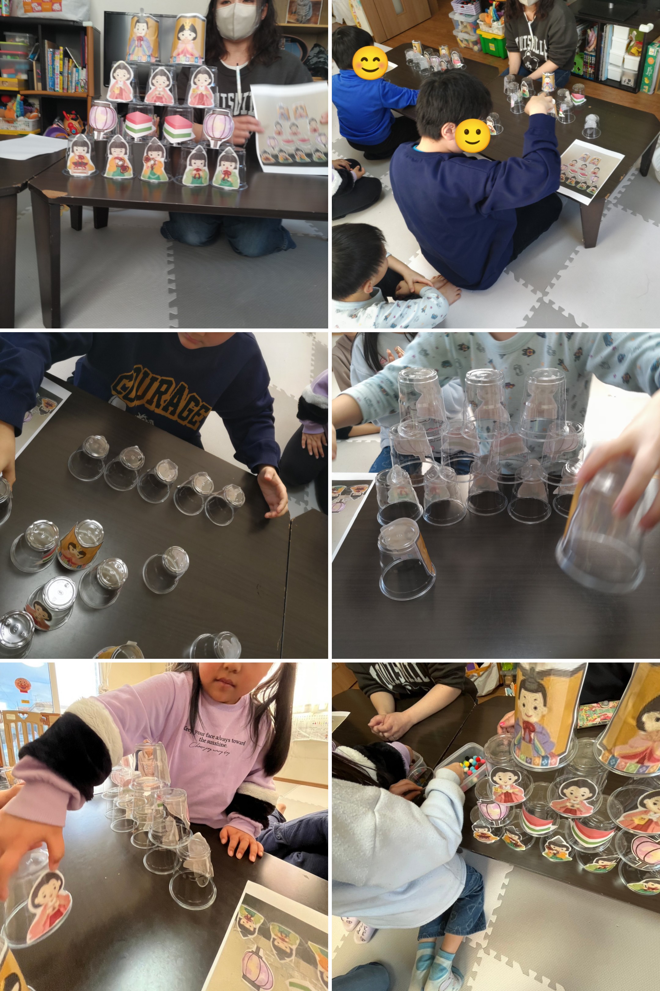 視覚情報、重ねるバランス感覚、スピード感、チーム力、が養われるひな祭りレクとなりました。