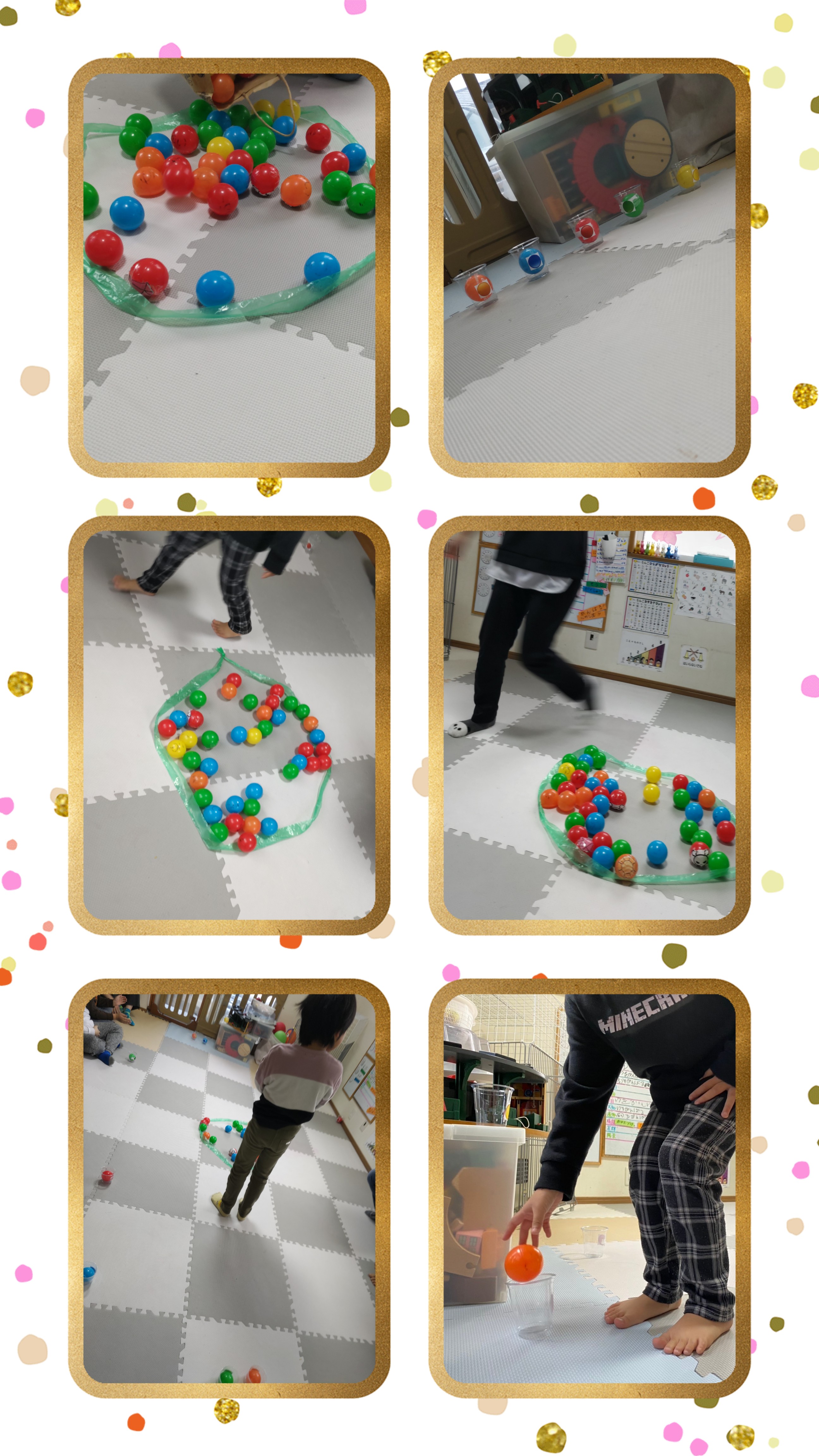 カラーボールが入っている円の周りをクルクル周り音楽が止まったらカップに貼られてる色のボールをカップにいれるよ!!