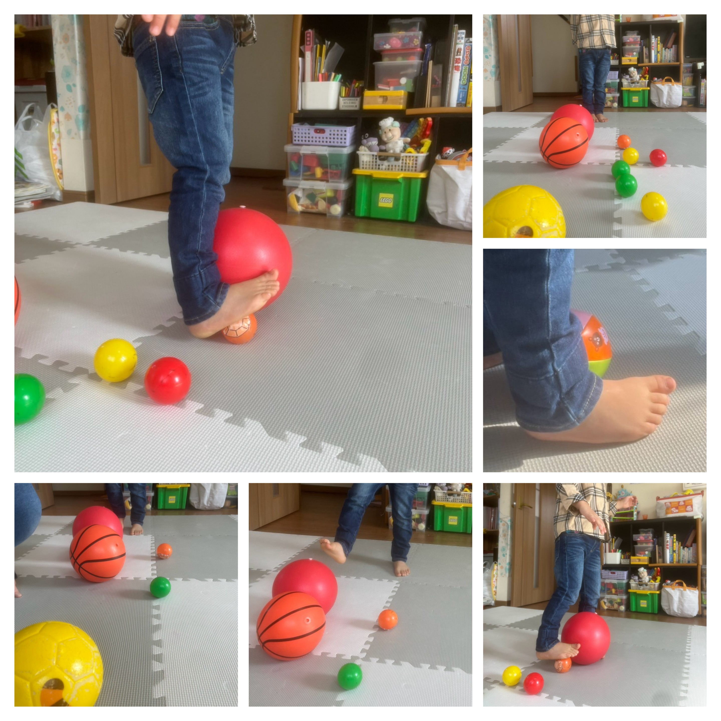 足に大・中・小のボールを挟み前進し籠の中へジャンプして入れるよᕙ(@°▽°@)ᕗ