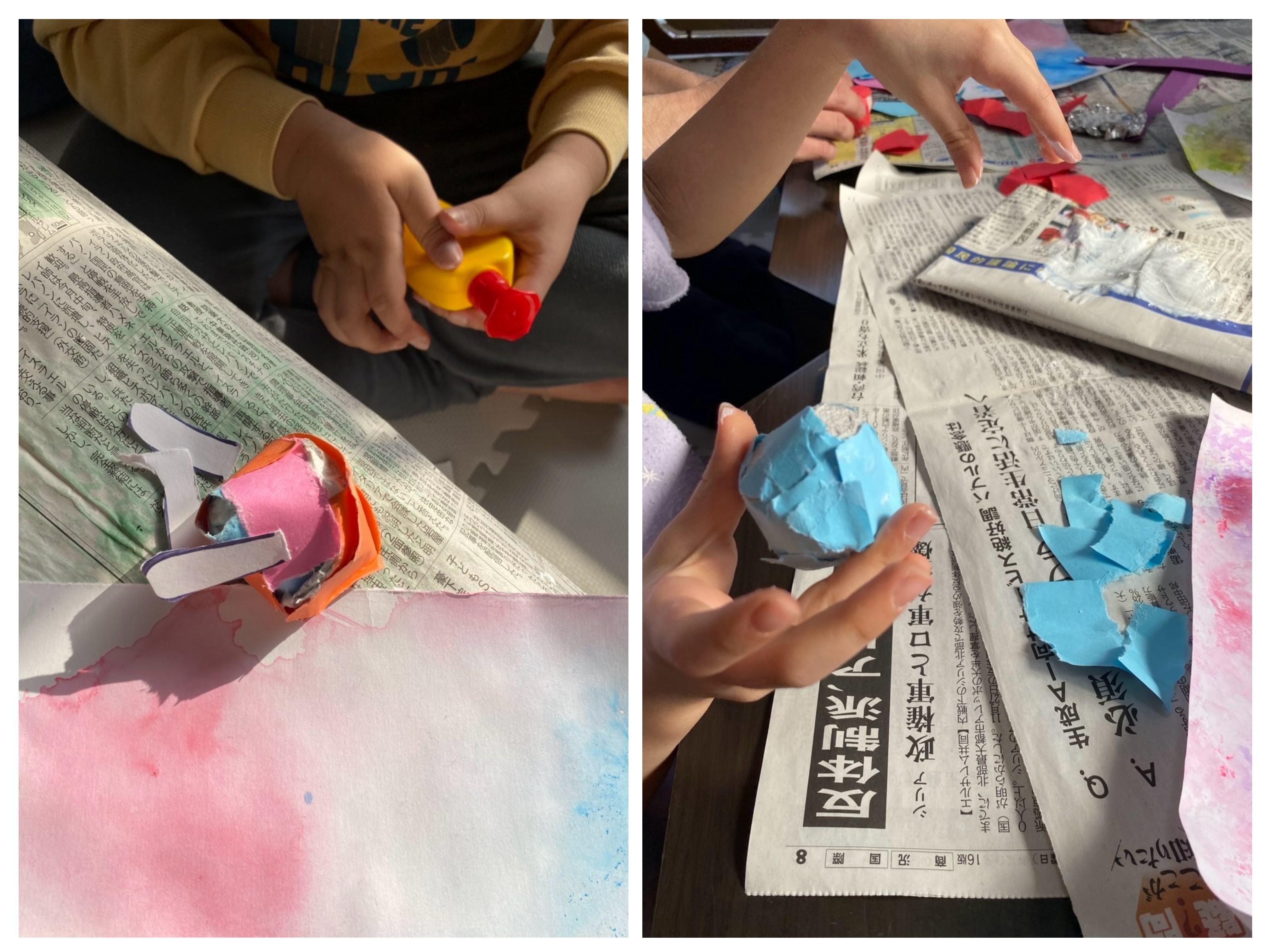 カラフルに色付けされた画用紙をちぎり、たまご型の紙にペタ!ペタ!
