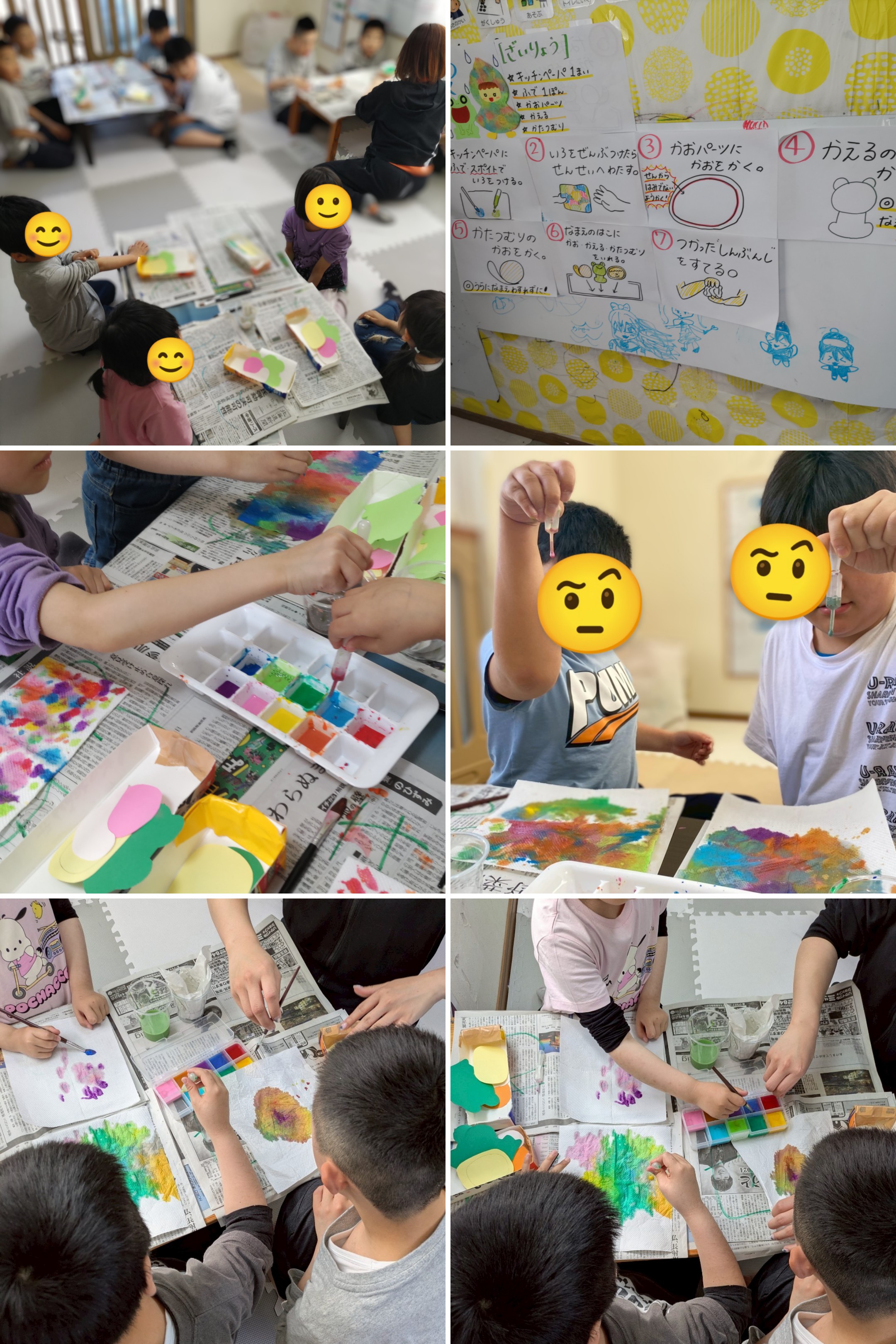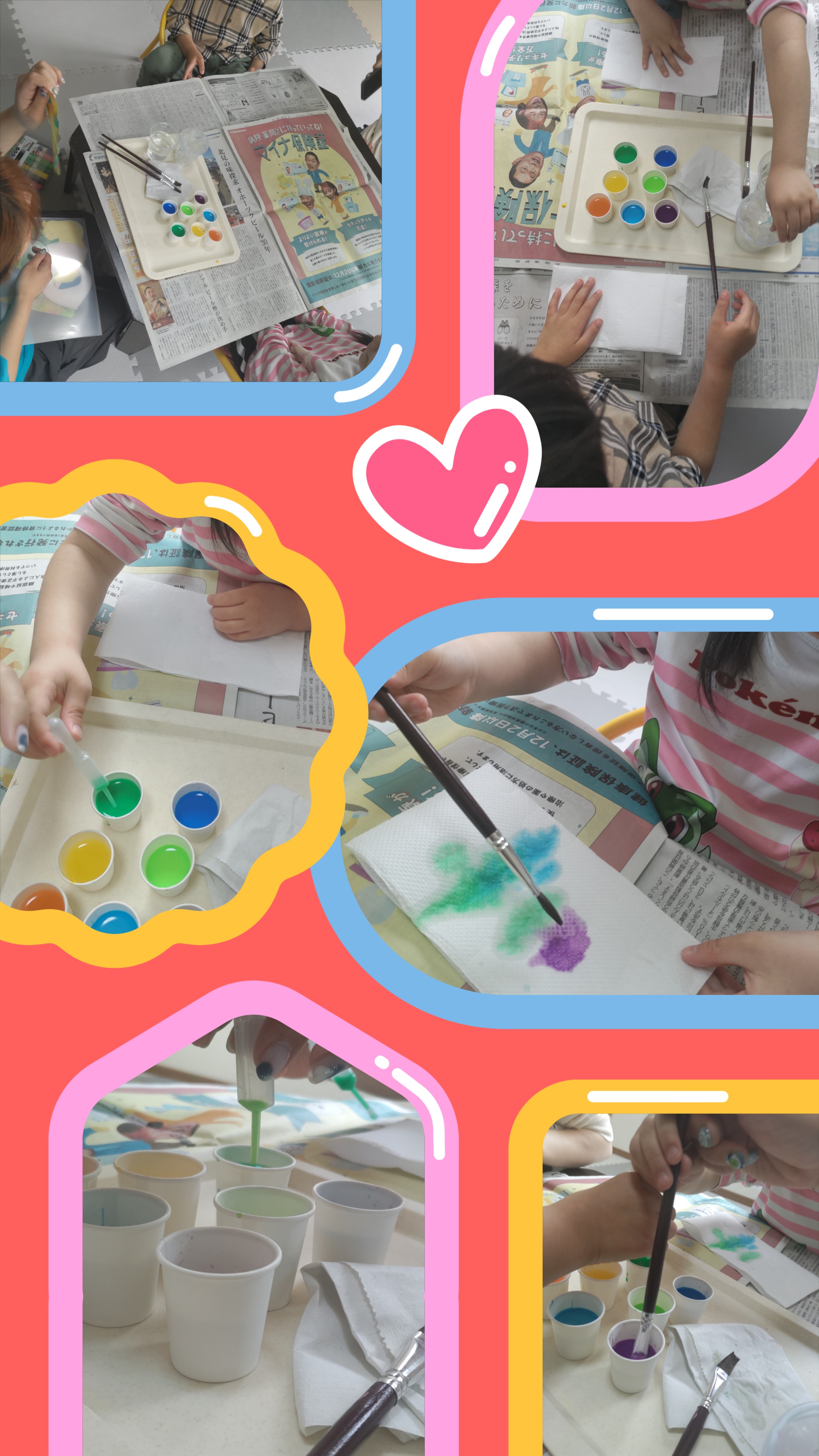 真剣に色の混ざり合いの変化を確認しながら、お友達と見せ合いっこしながら楽しんで取り組む姿いっぱいでした
