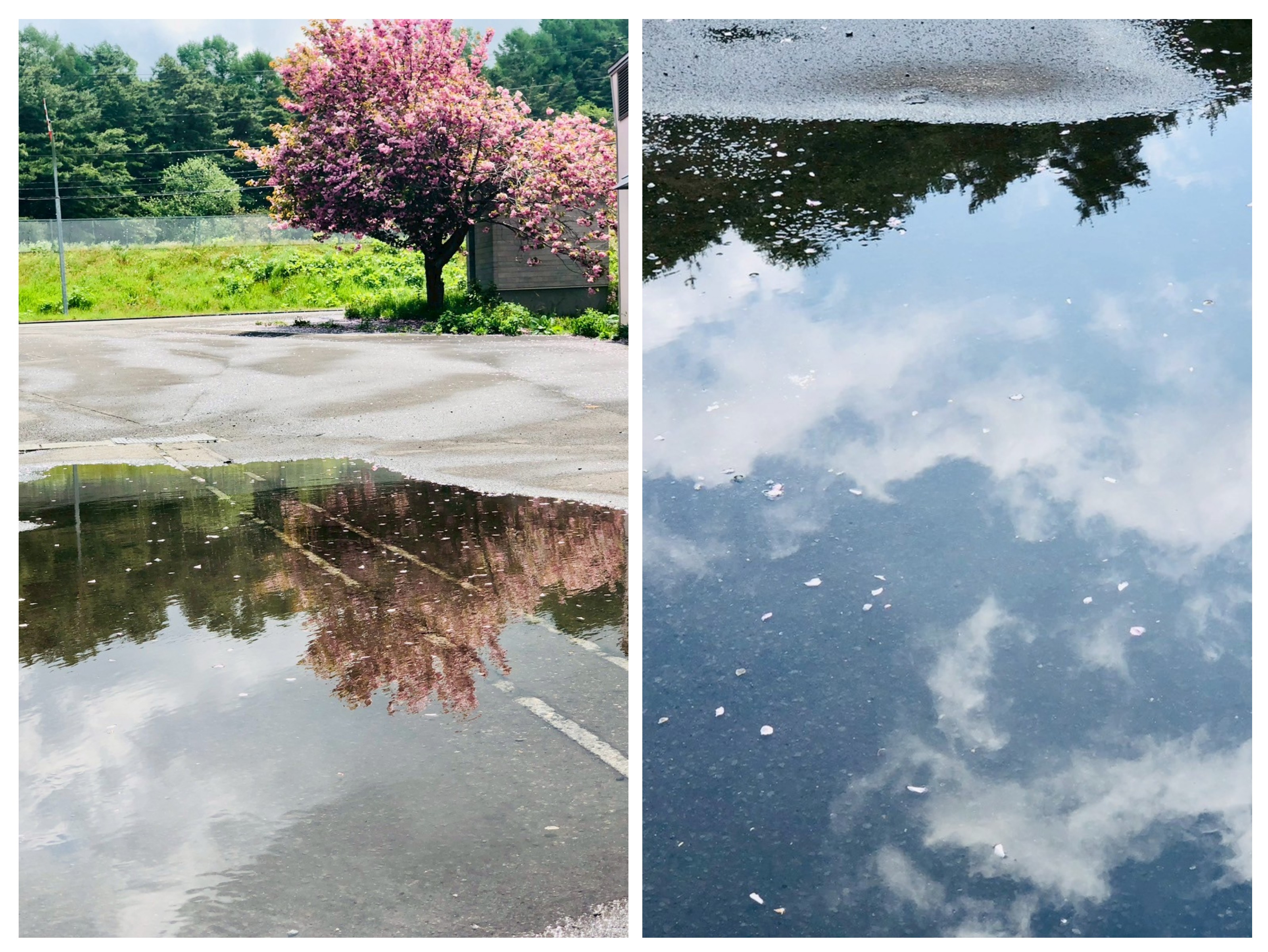 桜の花びらがヒラヒラ舞い散る姿、水溜りに反射し浮かぶ花びらも美しい♡