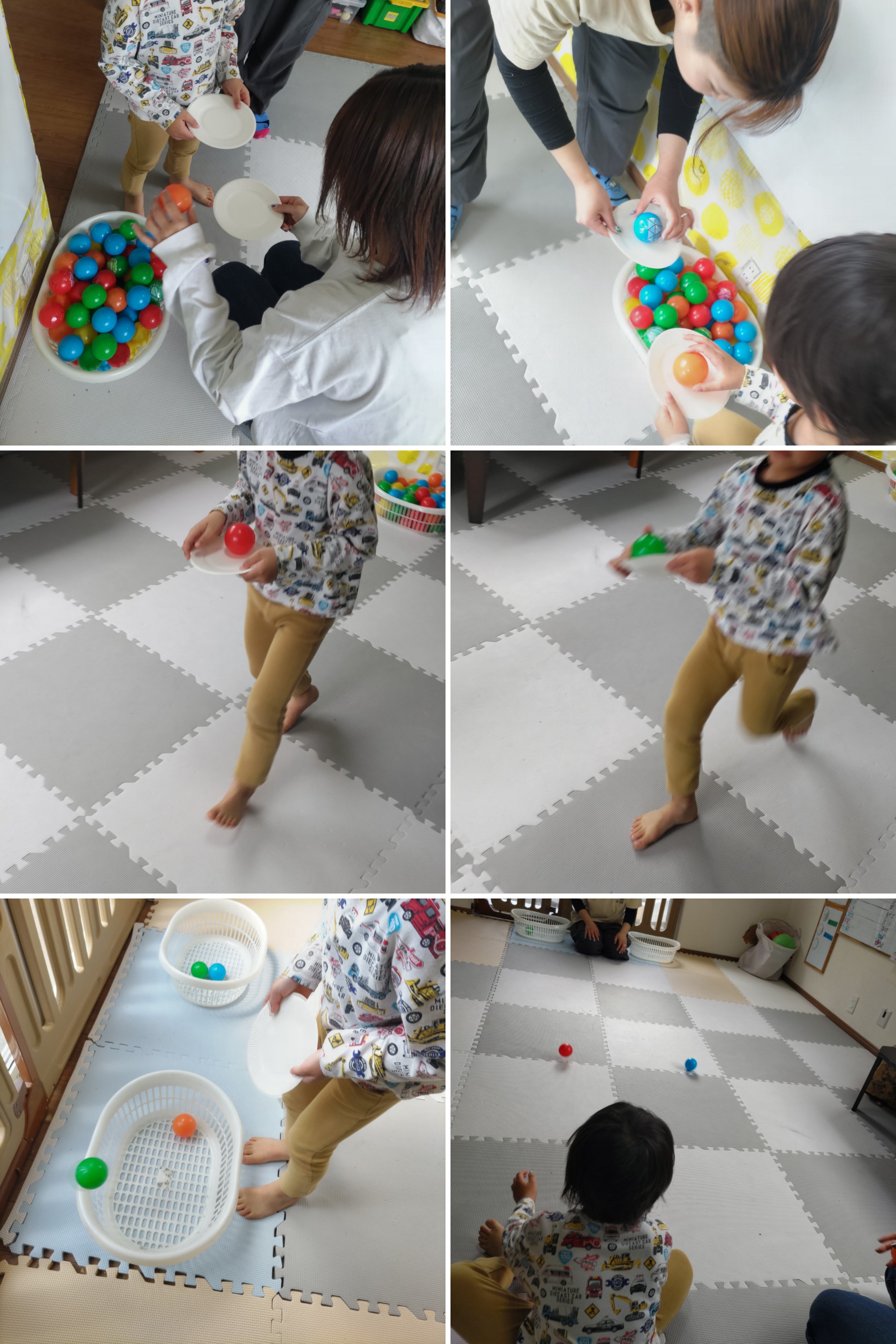 紙皿の上にボールを乗せ運んでカゴに入れるよ!!