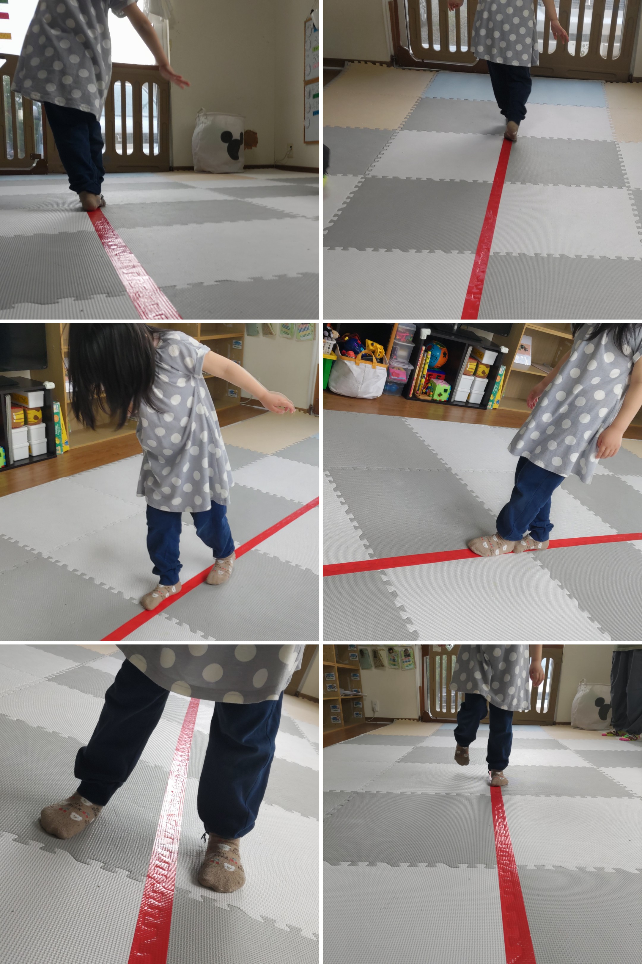 両手を広げバランスをとりながら、真っ直ぐ歩きやケンケンパに挑戦୧( ˵ ° ~ ° ˵ )୨