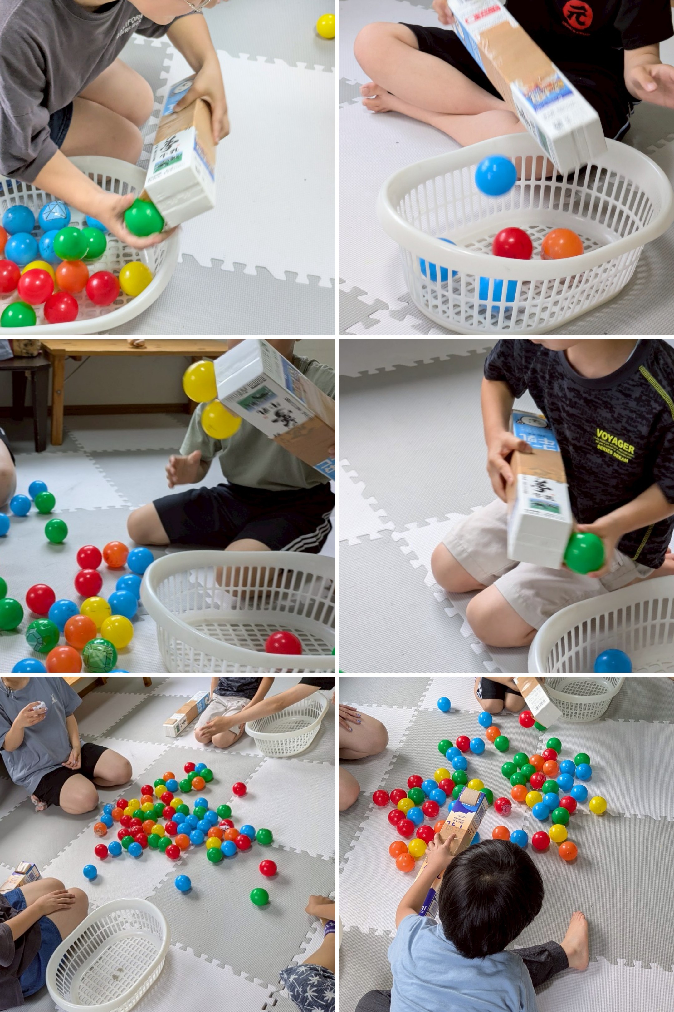 牛乳パックの先についてるガムテープでカラーボールをいくつペタ!してカゴに入れれるかな??