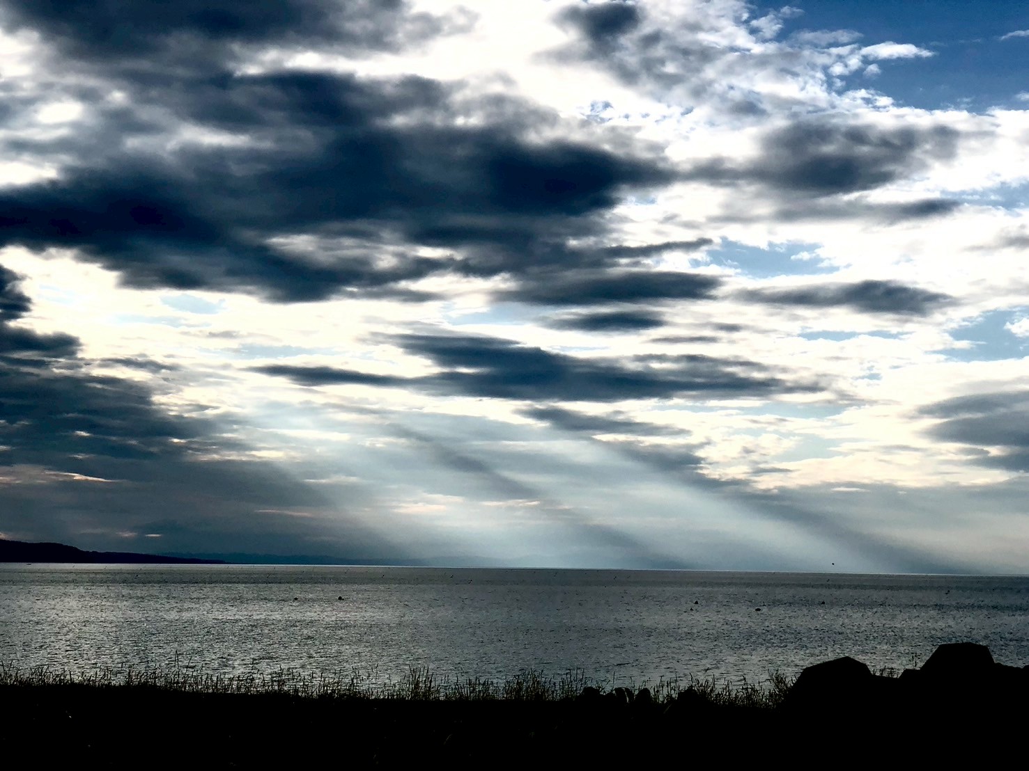 雨上がり雲の隙間から噴火湾にあたる太陽スポットライト。