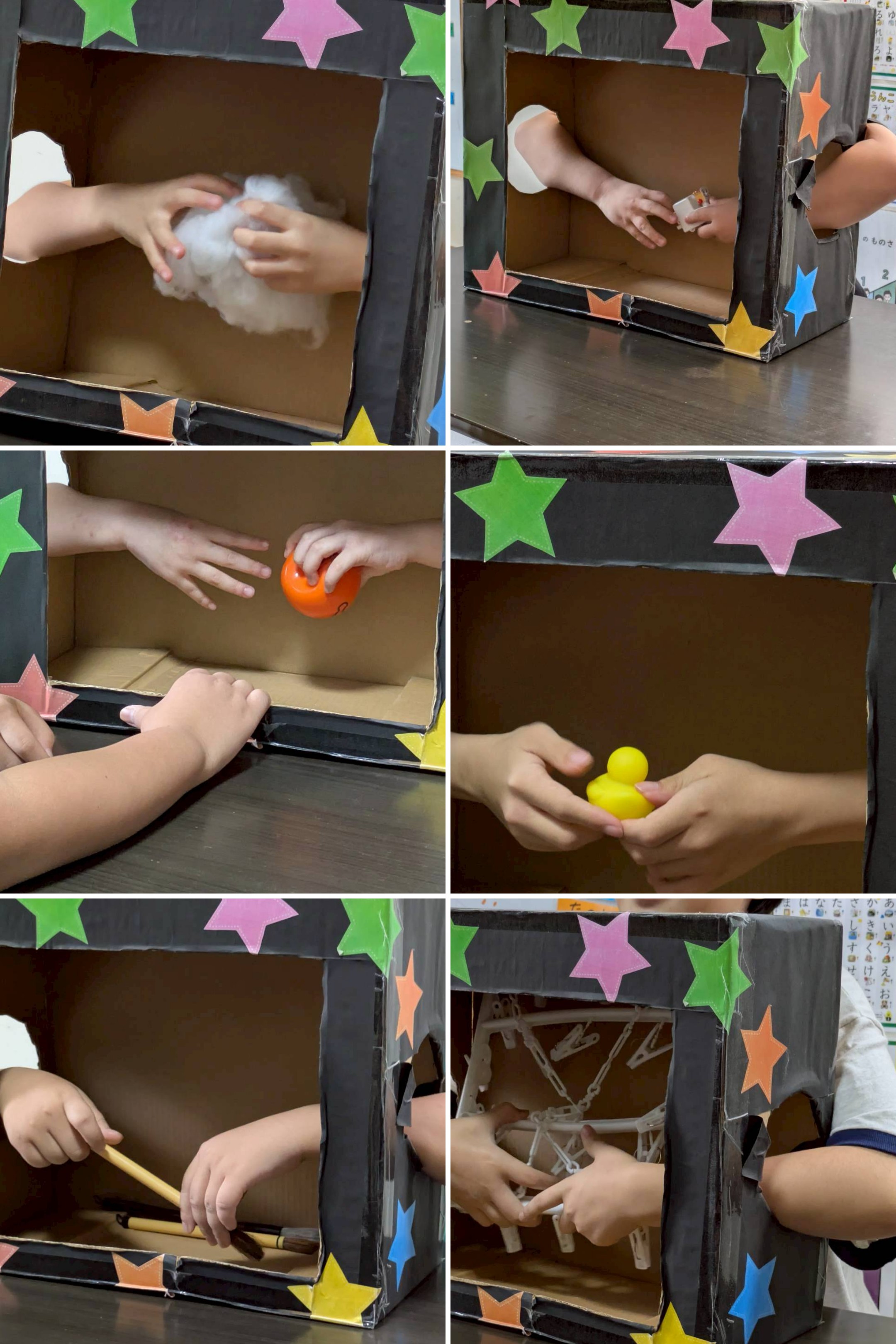 手のひらの感触、感覚で箱の中身を当てなければならず、視覚からの情報がない、何が入っているか分からない箱の中に手を入れるのは、とっても勇気が必要になります。