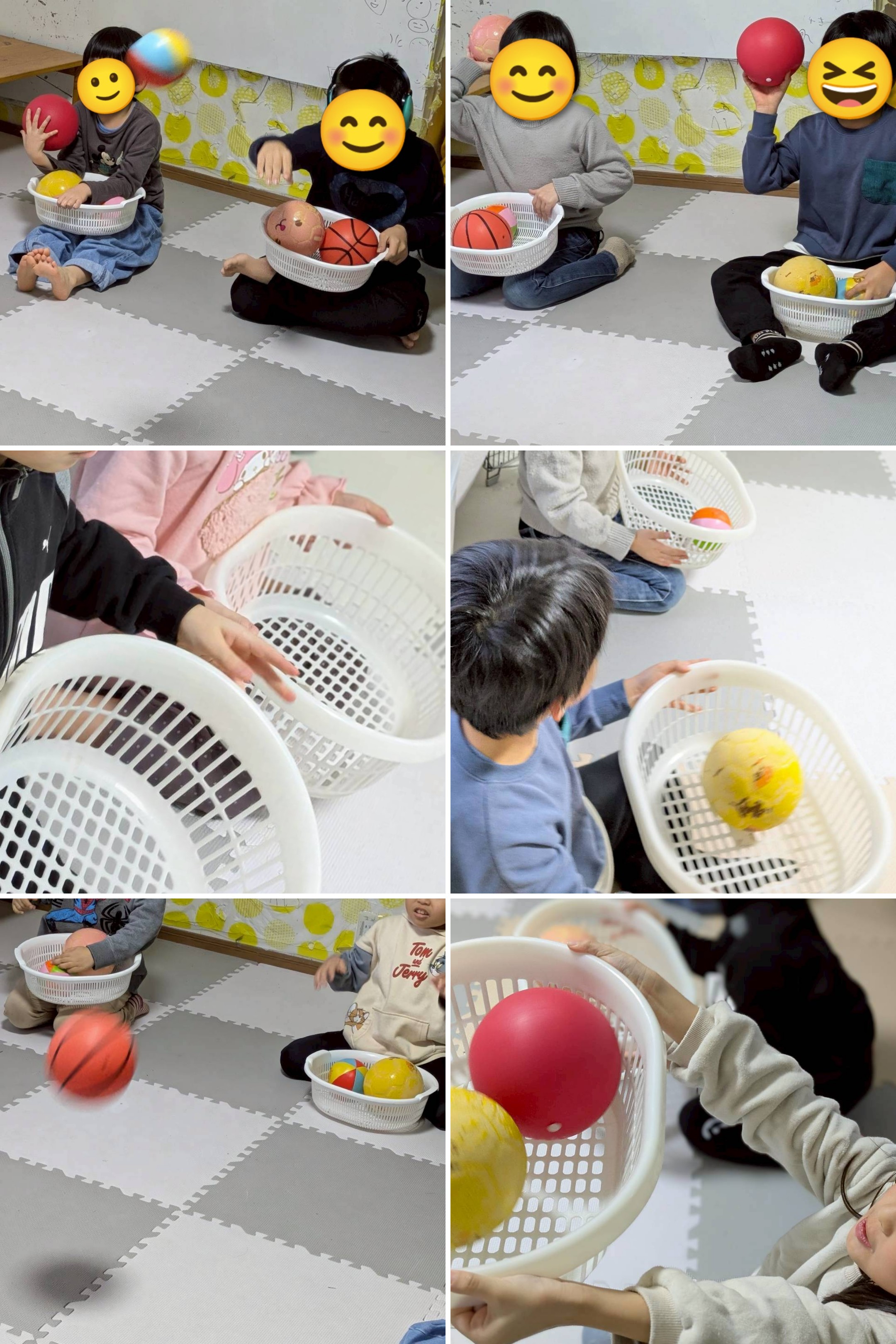 二人一組でカゴに入れる子、カゴでキャッチする子にわかれ、大中小のボール全てカゴでキャッチできるかな?!