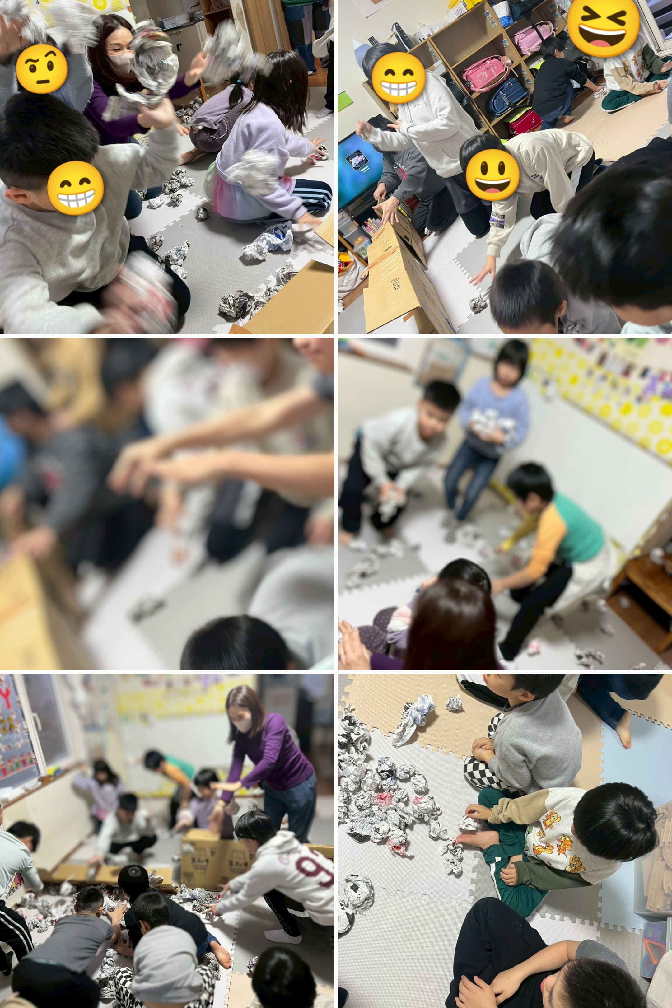 まだ外で雪合戦する程積もってないので予行練習も兼ねて雪合戦ならぬ「紙玉合戦!!」