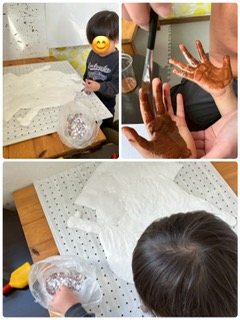 小学生チームより、一足先にホタテの貝殻をペタペタ。
