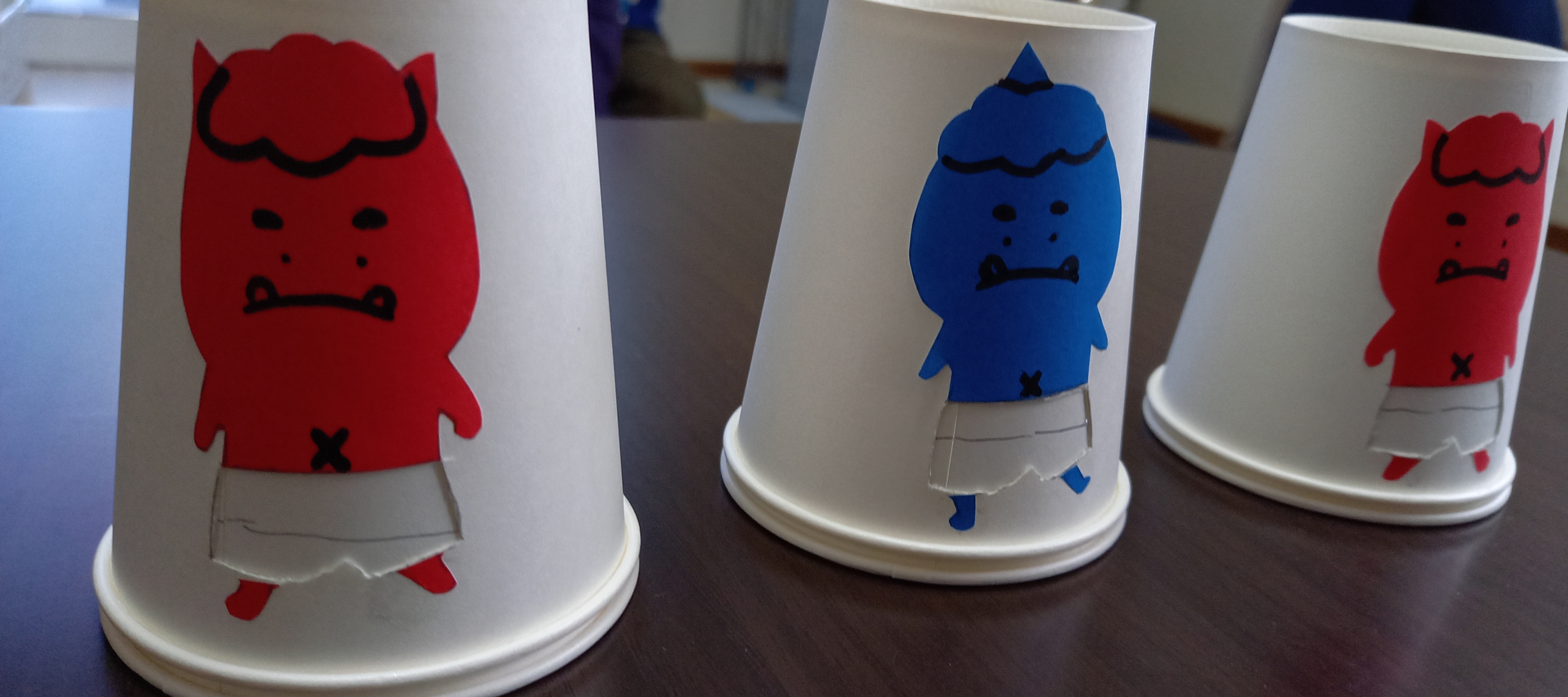 重ねた紙コップの下を回すと鬼のパンツの柄が変わるように、それぞれが選んだマスキングテープを張りオリジナル鬼のパンツ出来上がり!!